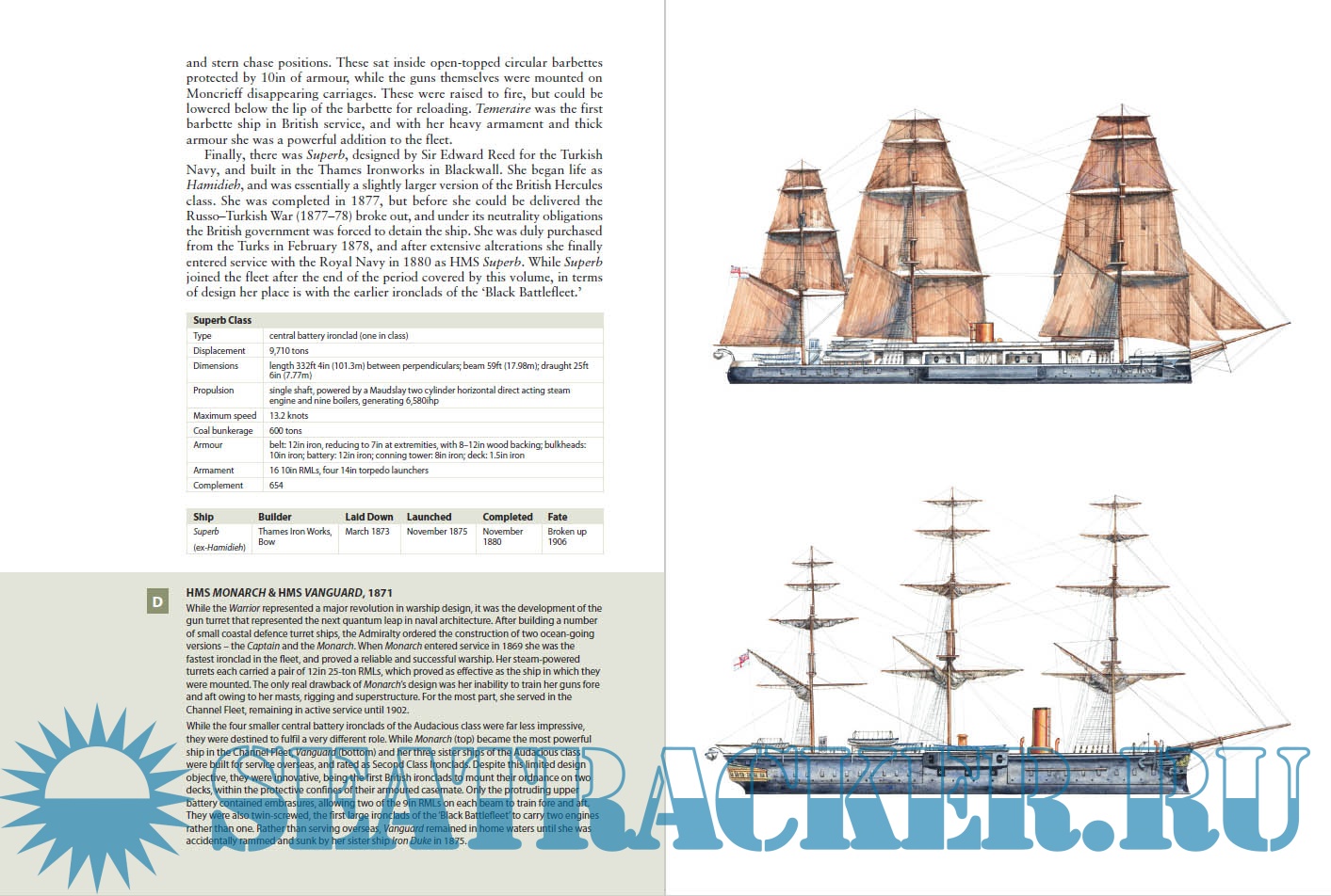 Year: 2018 Language: english Author: Angus Konstam Genre: History Publisher: Osprey Publishing Edition: New Vanguard 262 Format: PDF Quality: eBook Pages count: 49 Description: In November 1859, the French warship La Gloire was launched. She was the world's first seagoing ironclad - a warship built from wood, but whose hull was clad in a protective layer of iron plate. Britain, not to be outdone, launched her own ironclad the following year - HMS Warrior - which, when she entered service, became the most powerful warship in the world. Just like the Dreadnought half a century later, this ship changed the nature of naval warfare forever, and sparked a frantic arms race. The elegant but powerful Warrior embodied the technological advances of the early Victorian era, and the spirit of this new age of steam, iron and firepower. Fully illustrated with detailed cutaway artwork, this book covers the British ironclad from its inception and emergence in 1860, to 1875, a watershed year, which saw the building of a new generation of recognisably modern turreted battleships.