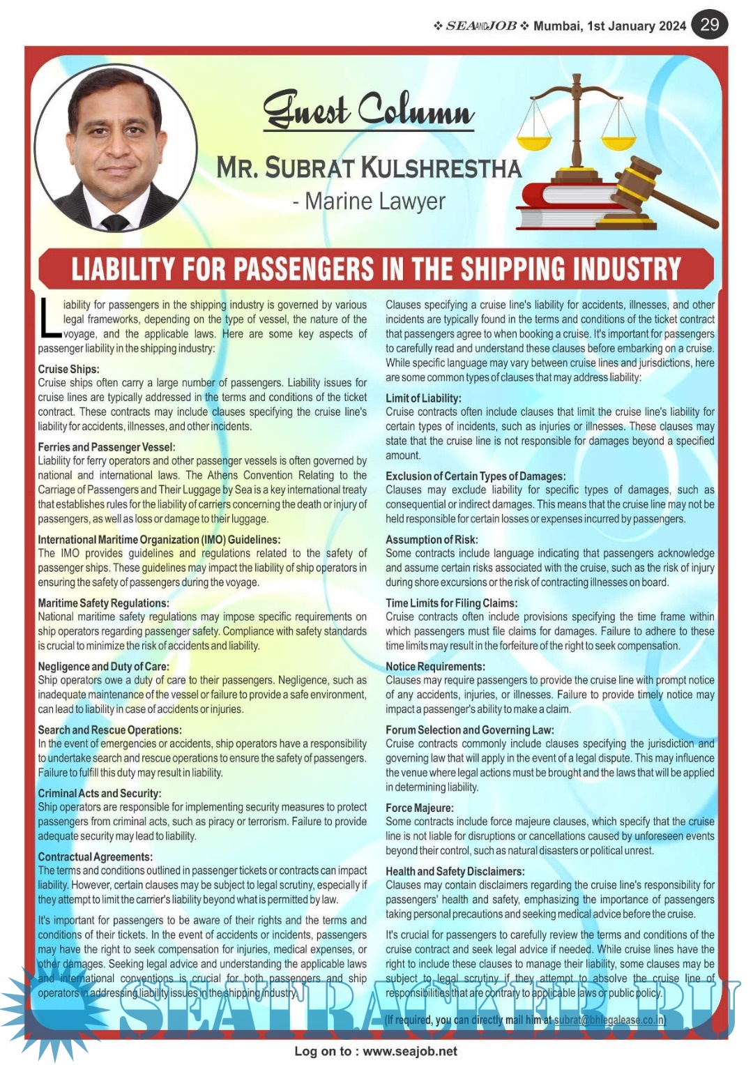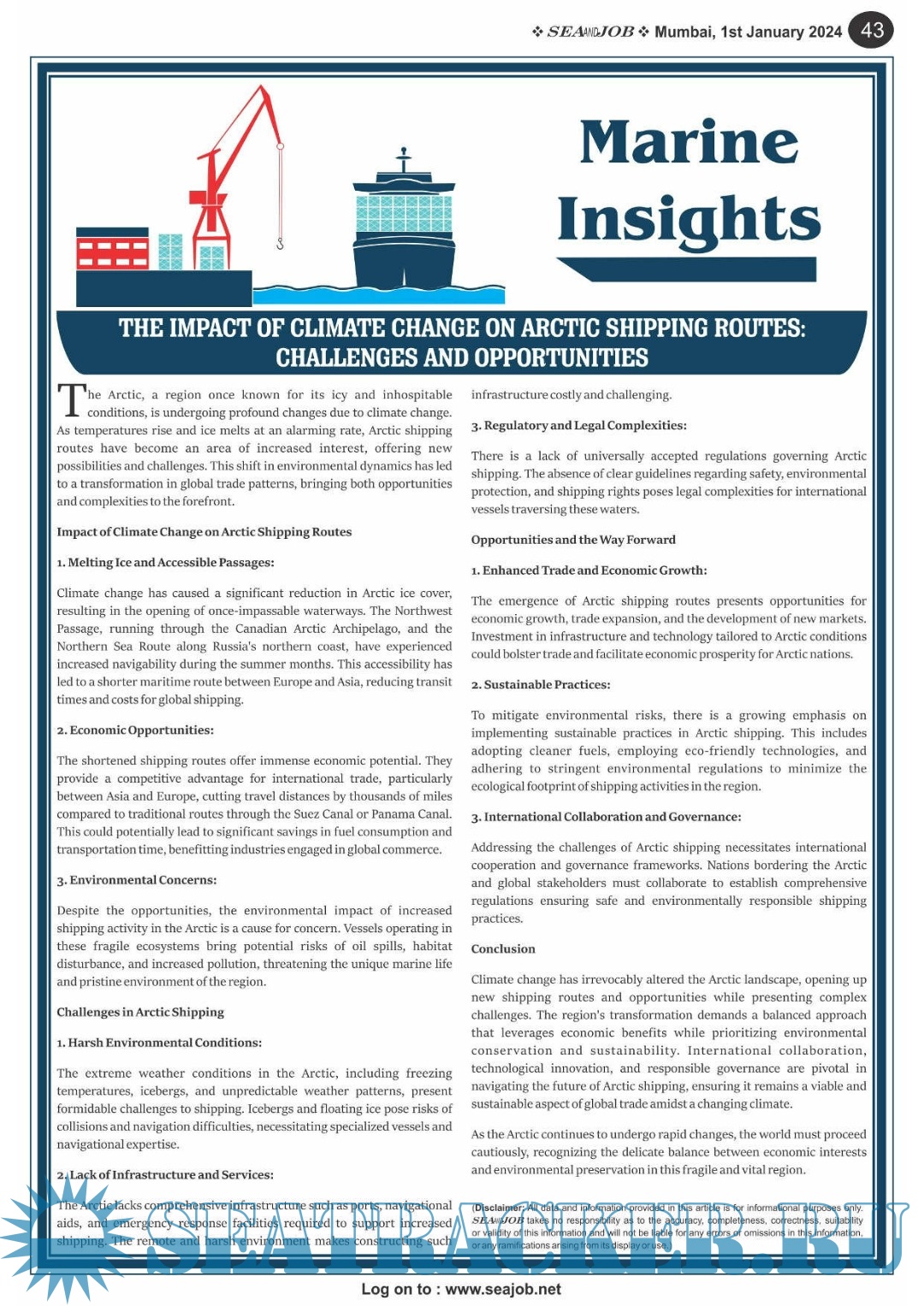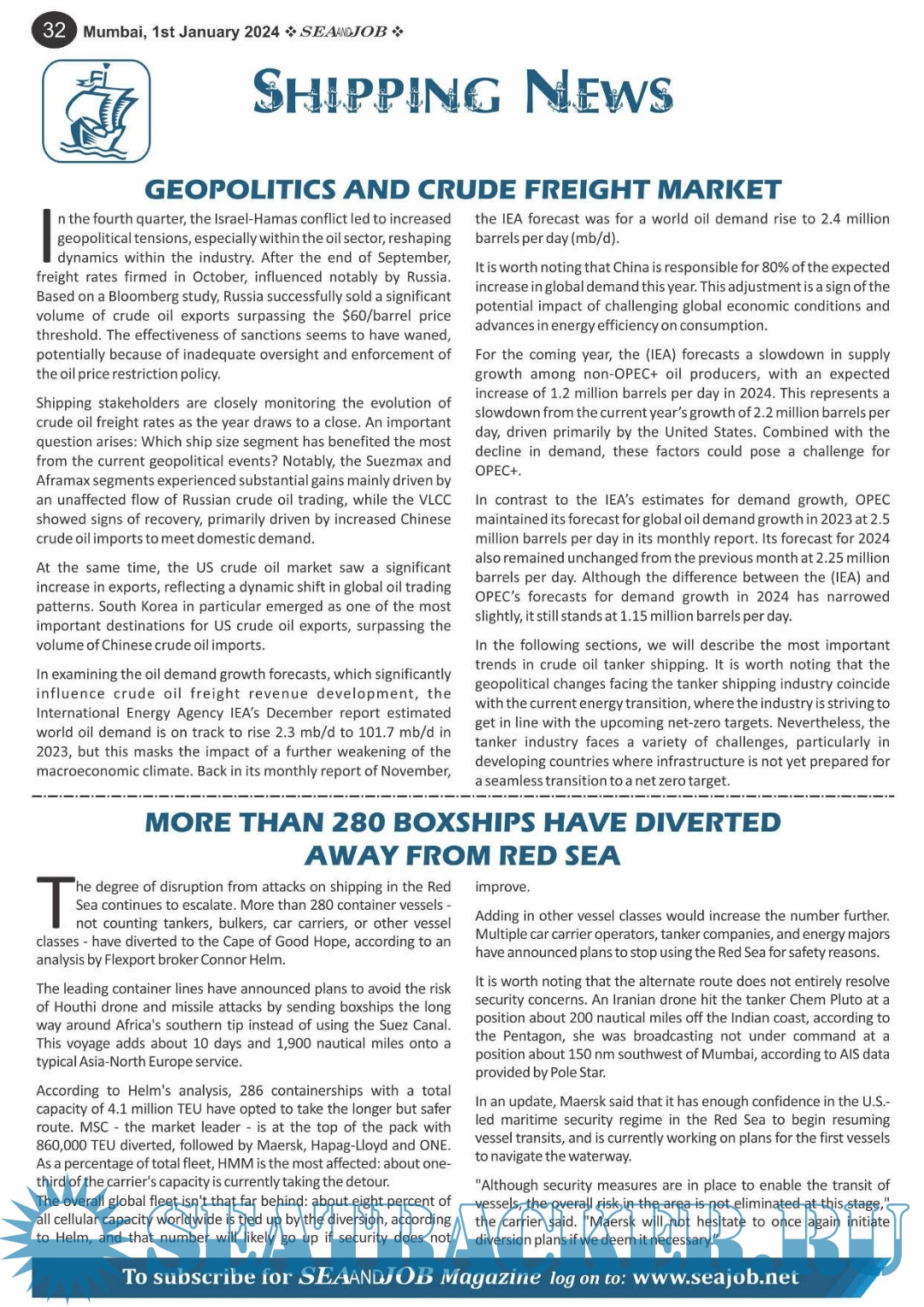 Description: The Sea and Job magazine launched in May 2007, was the second venture of Sea Line Group succeeding 'seajob.net' bringing the much renowned essence to the Group, the Sea and Job Magazine quickly gained popularity, becoming the No. 1 Shipping Magazine that came to be widely circulated all over India. Sea and Job over the years has evolved as the most trusted, ethical, objective and read maritime publication that possesses a large database of subscribers from various verticals in the industry.The magazine provides informative and interesting articles covering not just the shipping world but also the world outside it.Sea and Job is also a medium for the shipping/ manning companies to advertise marine jobs and also to promote their organization by publicizing internal activities like seminars, sports events and parties.Some notable endeavors of the magazine include the Know Your Recruiter Column, the Sailing Episodes Column and the Marine Insights section. The consistent efforts and the dedication to provide extraordinary services to the industry has resulted in the magnifying popularity and patronage of Sea and Job.