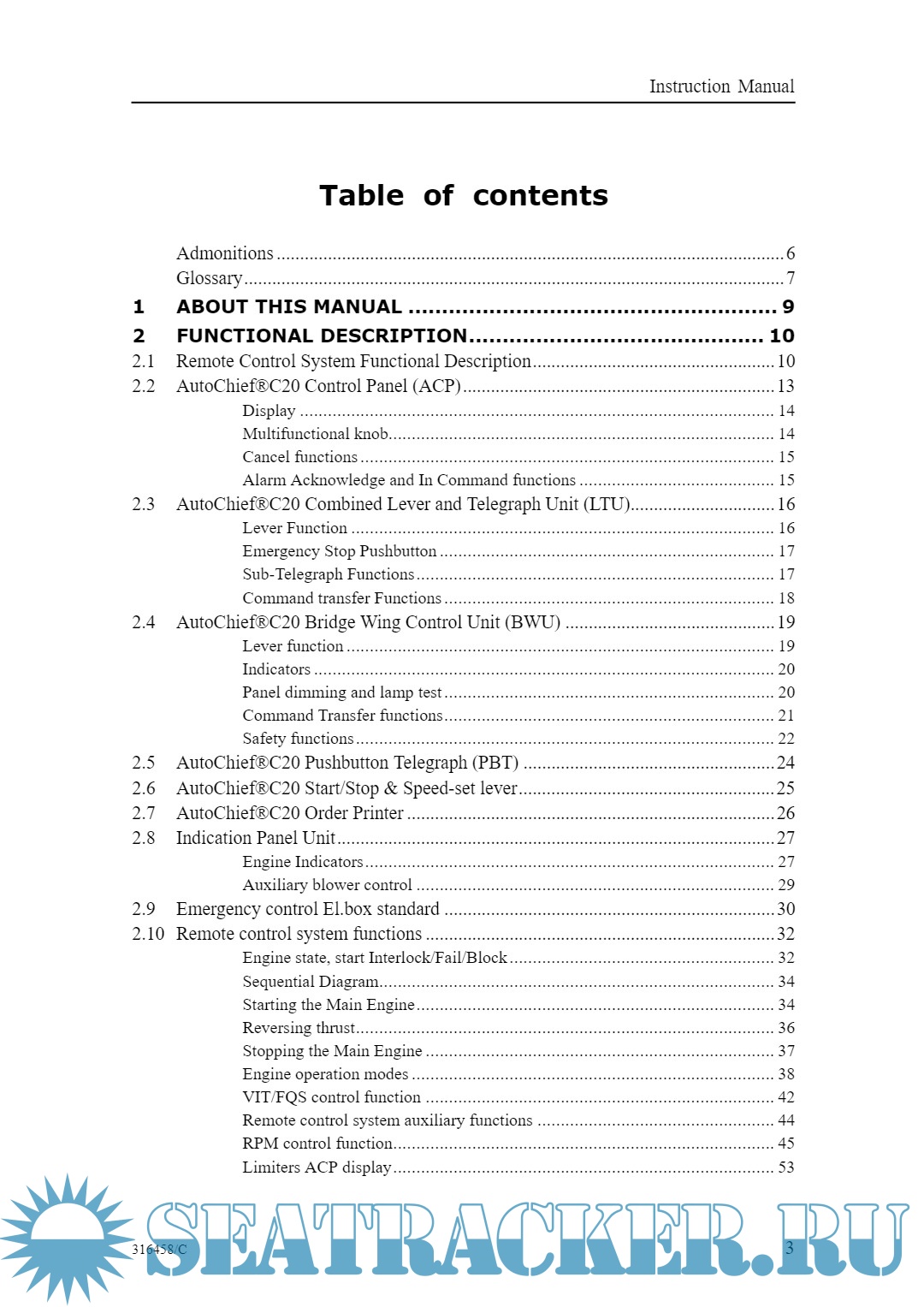Description: This instruction manual for the AutoChief®C20 Propulsion Control System is intended as a guide for the ships personnel while operating the engine on a daily basis in transit between ports, assuming a standard configuration for MAN BW MC Engines with Fixed Pitch Propeller.