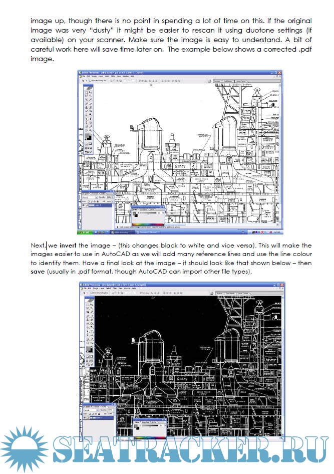 Description: The aim of this brief tutorial is to show a fast and easy way to convert an image (.bmp .jpeg .pdf etc) to a more accurate drawing using only 2 programmes. I use Photoshop and AutoCAD - there are others to use, and I will give a quick overview of these later. The method described here is accurate and fast, more or less detail can be added as required. Firstly, though, we must decide what the resultant drawing is to be used for. If it is to build a scale model, then a lot of the information on the original drawing will be superfluous. We only want enough information on our new drawing to allow us to proceed with the modelling. More detail can be added later. If, on the other hand, we want to produce a full drawing, then there are additional steps we can take to speed up the process.