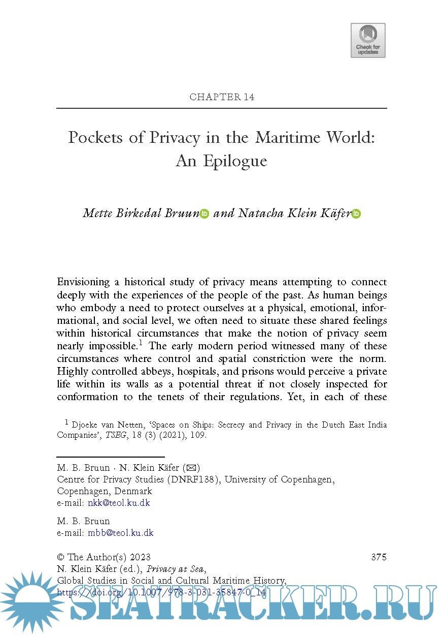 This volume adds a new dimension to this discussion by focusing on how privacy and the private were perceived and created by the historical agents at sea. We aim to move beyond the mercantile "private" as a direct opposite to the "public" or the State, thereby opening the discussion of privacy at sea as a multiplicity of lived experiences.