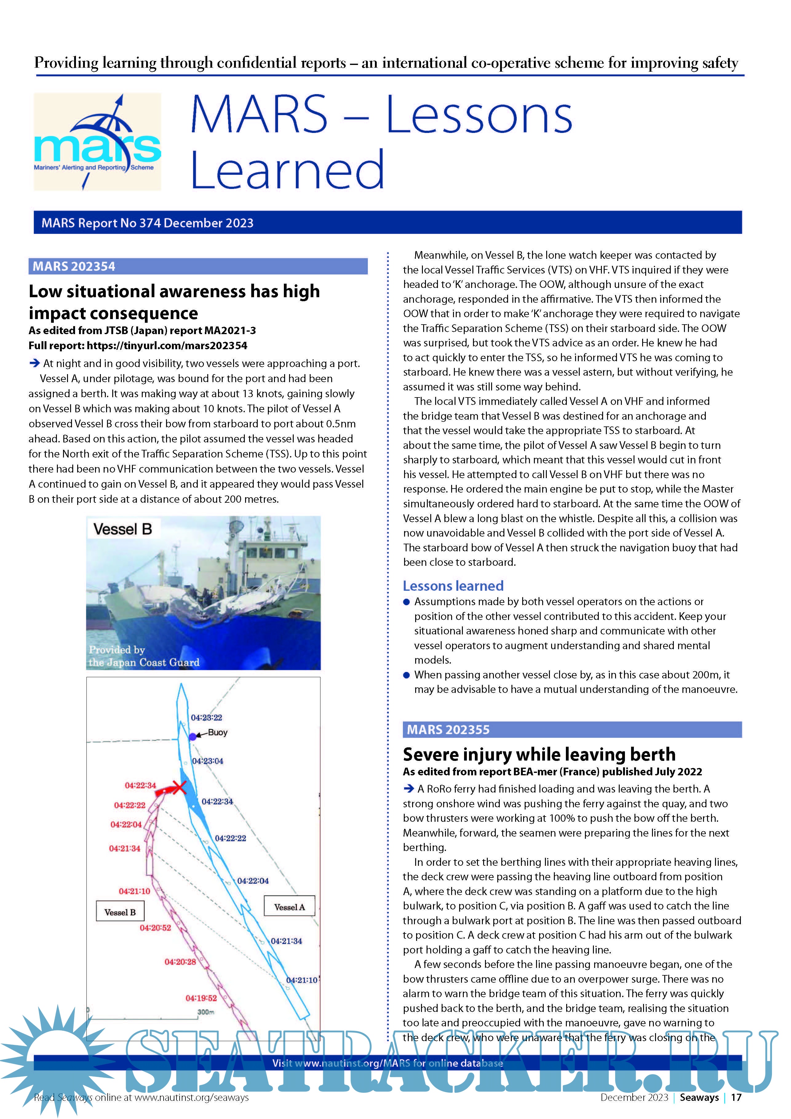 Year: 2023 Language: English Author: The Nautical Institute Genre: Periodical (magazine) Format: PDF Quality: eBook Pages count: 4 Description: MARS Report No.374 December, 2023 Providing learning through confidential reports – an international co-operative scheme for improving safety.MARS is a searchable database containing reports of accidents and near misses stretching back over a quarter of a century. Funded through the generous support of the Institute's Nautical Affiliate partners, it is one of the maritime industry's leading risk reduction initiatives and is helping to make life safer for seafarers everywher.