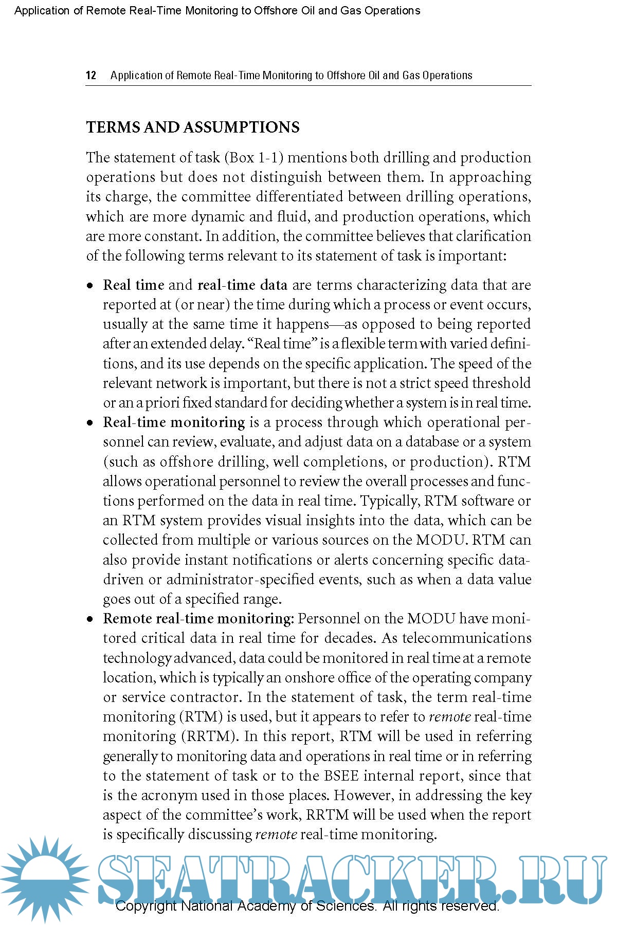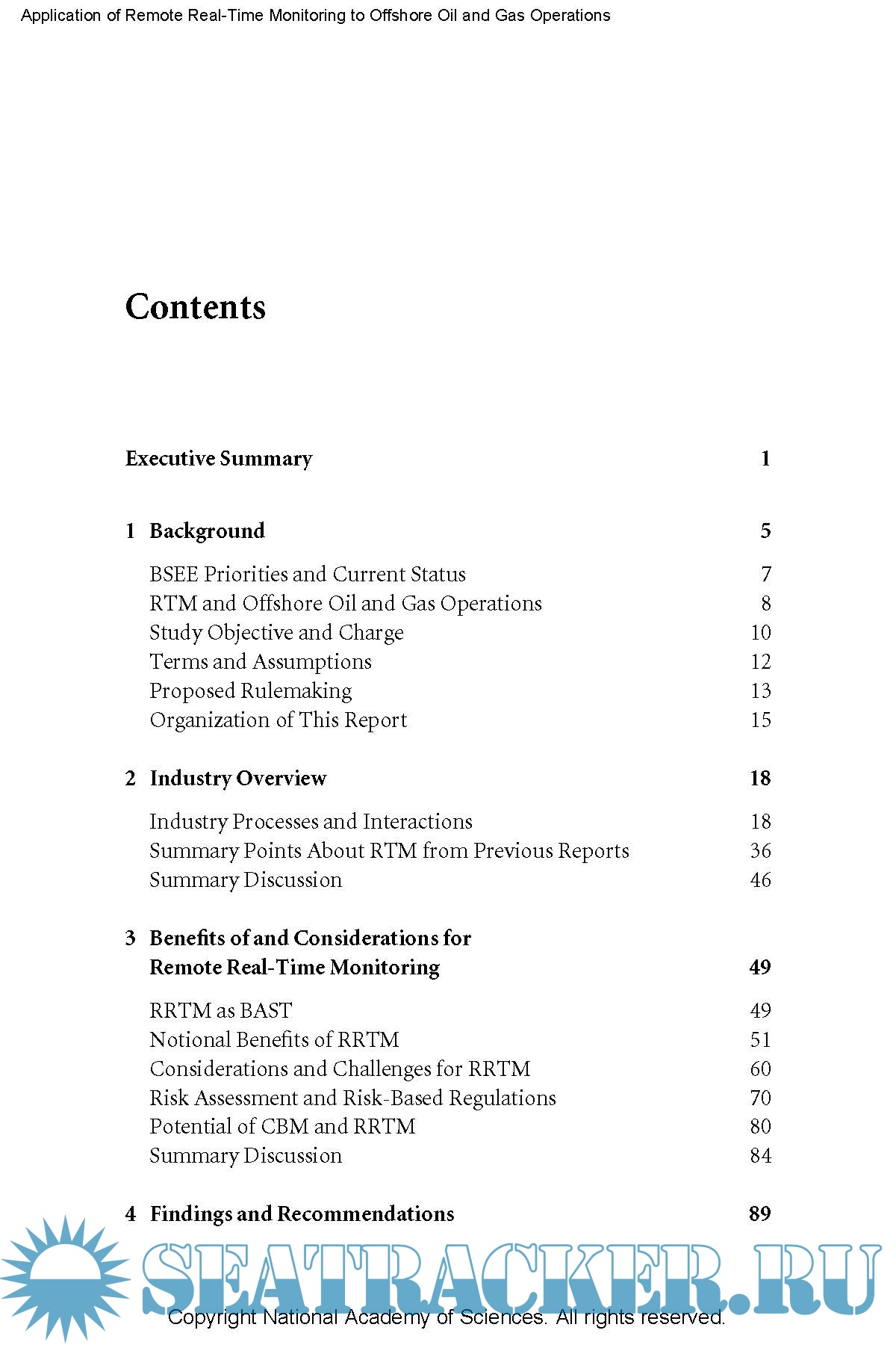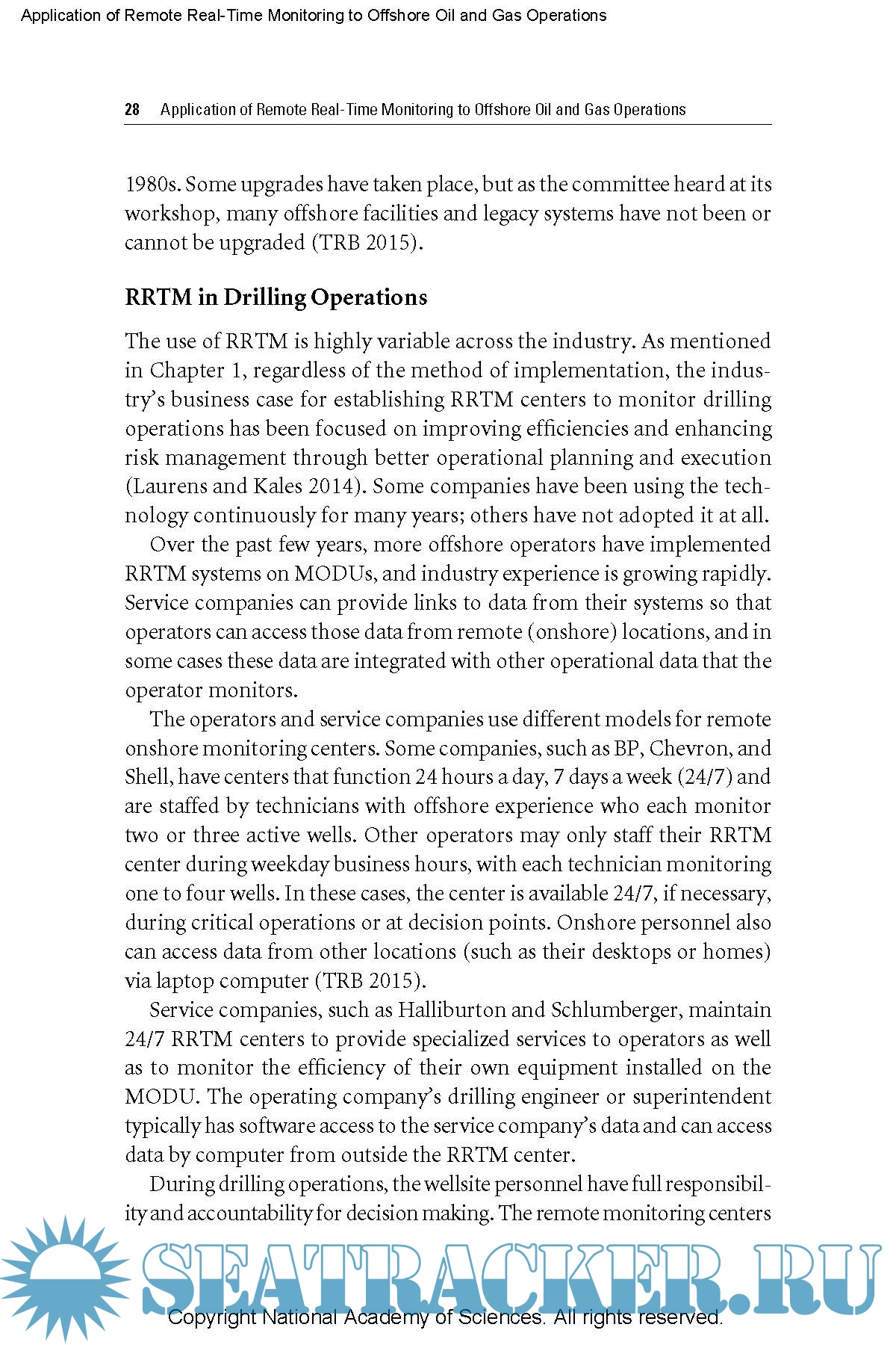 Year: 2016 Language: English Author: National Academy of Sciences Genre: Handbook Format: PDF Quality: eBook Pages count: 139 Description: The Bureau of Safety and Environmental Enforcement (BSEE) of the U.S. Department of the Interior requested in July 2014 that the Marine Board of the National Research Council (NRC) conduct a study advising the agency on the use of real-time monitoring (RTM) to improve the safety and reduce the environmental risks of offshore oil and gas operations. The charge from BSEE and related background material are given in Chapter 1. Specifically, the committee was asked to address five main tasks on the use of RTM (see the statement of task, Box 1-1 in Chapter 1): 1. The critical operations and specific parameters that should be monitored from drilling and producing facilities to manage and mitigate environmental and safety risks (e.g., to reduce the risk of well kicks, blowouts, and other sources of casualties), 2. The role that automation and the use of predictive software tools should play in RTM, 3. The role that condition-based monitoring should play in RTM and how the operating equipment using condition-based monitoring could be tailored to and/or used for RTM, 4. Whether RTM should be incorporated into BSEE’s regulatory scheme in either a prescriptive or performance-based manner, and 5. How BSEE should leverage RTM to enhance its safety enforcement program.