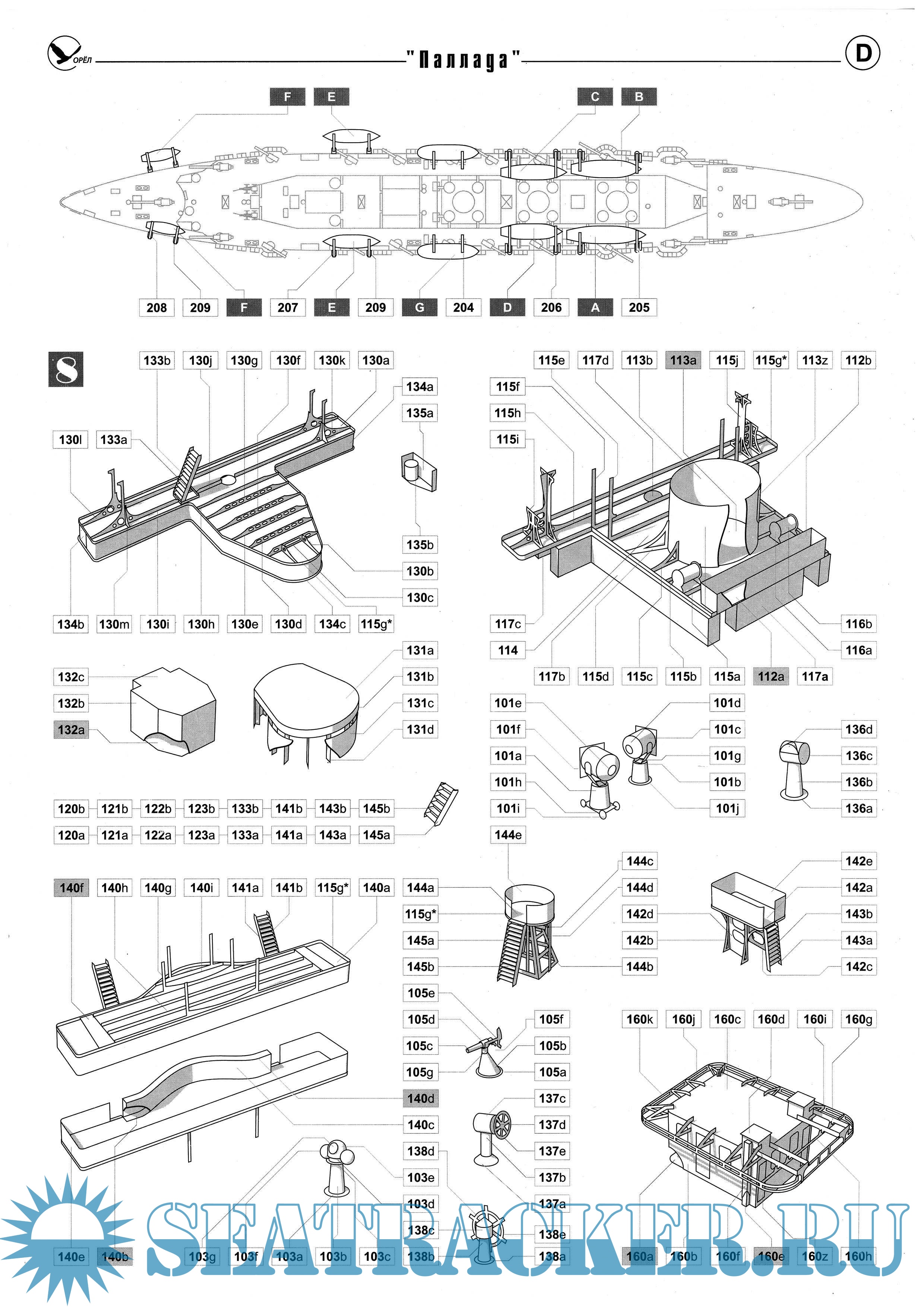 41 лист цветных выкроек и инструкций для изготовления бумажной модели бронепалубного крейсера I ранга Паллада по состоянию на 1902 год в масштабе 1:200