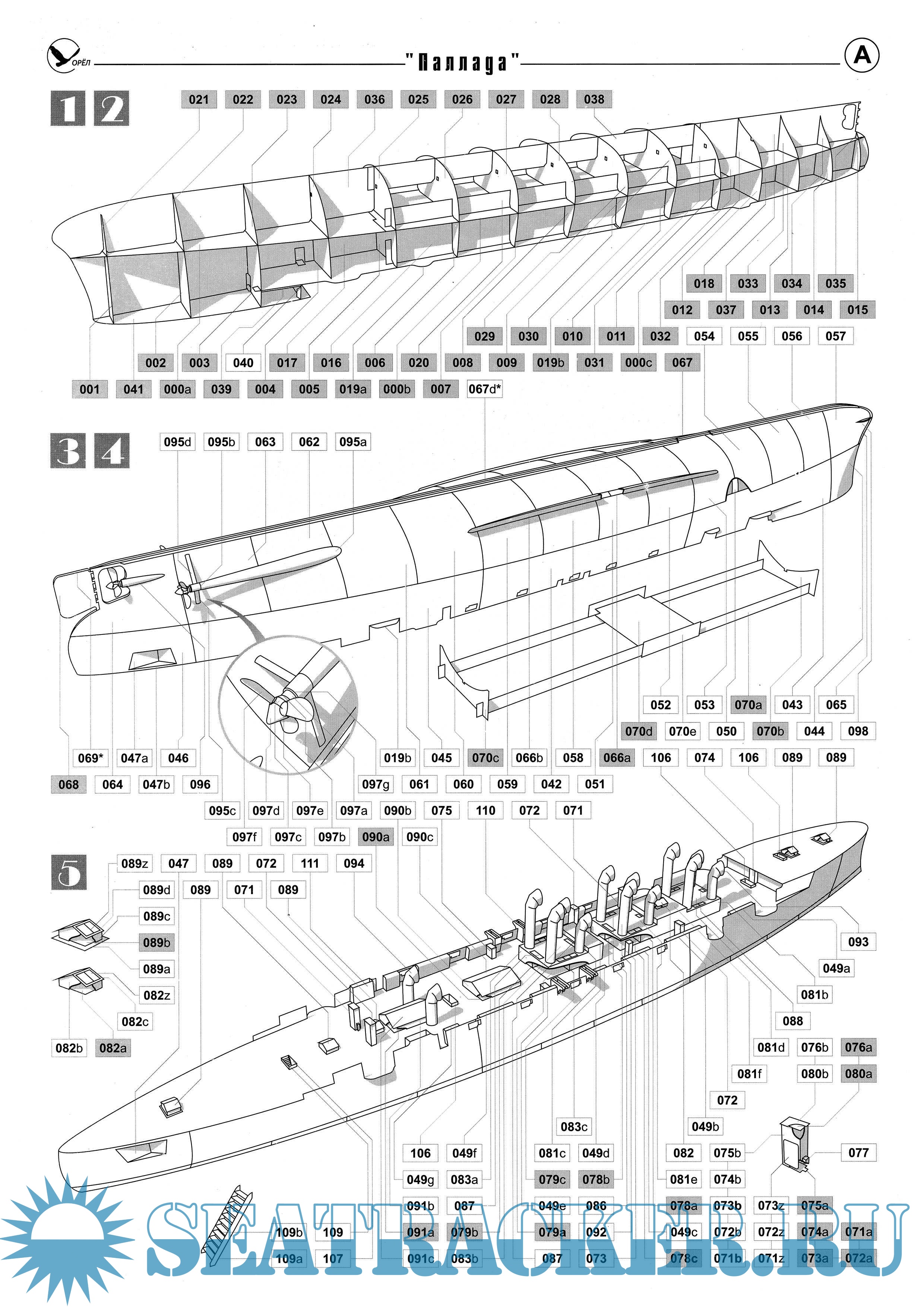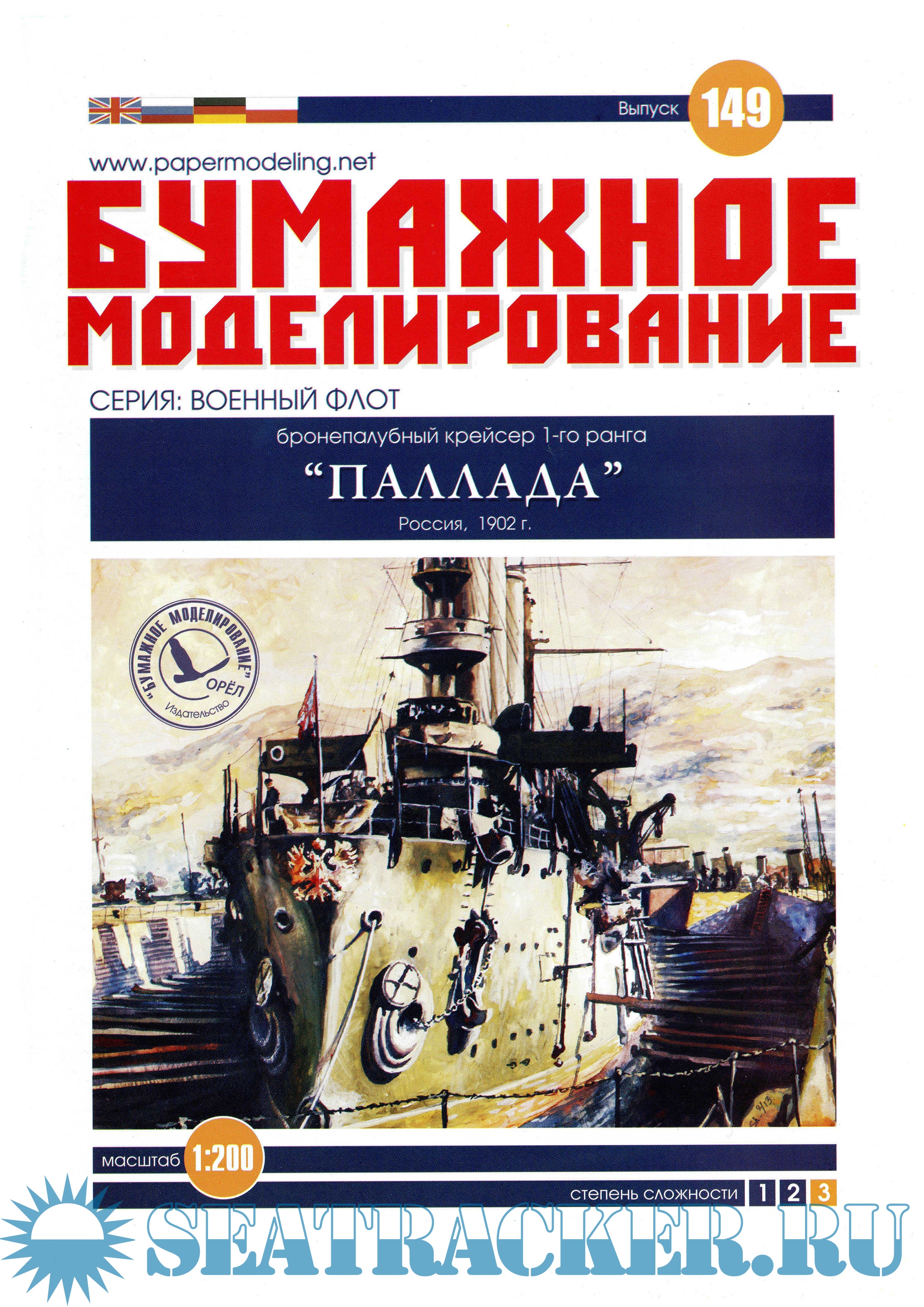 Описание: 41 лист цветных выкроек и инструкций для изготовления бумажной модели бронепалубного крейсера I ранга Паллада по состоянию на 1902 год в масштабе 1:200