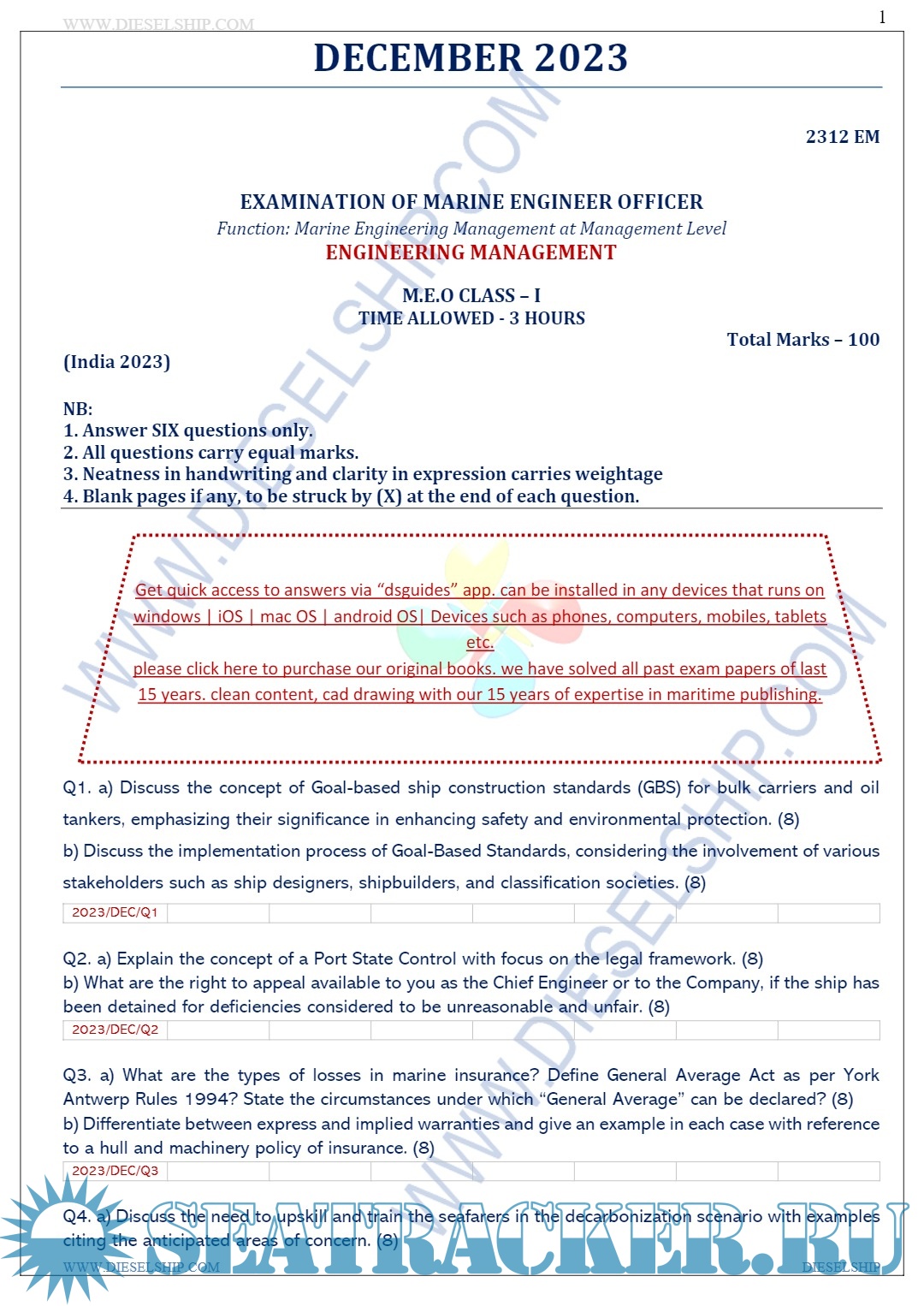 Description: M.E.O. Class I Question Paper set for Mercantile Marine Department (MMD), D.G. Shipping India Exams.