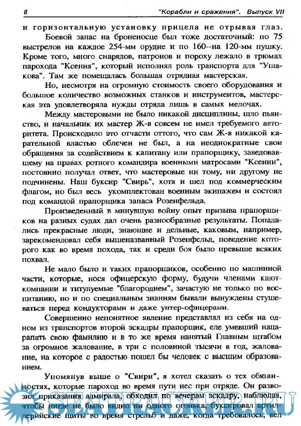 Год выпуска: 1997 Язык: русский Автор: Дмитриев Н.Н. Жанр: История Издание: Серия: Корабли и сражения Формат: PDF Качество: Отсканированные страницы Количество страниц: 76 Описание: Судьба автора этих воспоминаний Николая Николаевича Дмитриева (1876- 1931гг.) сложилась довольно удачно, если это слово применимо к его поколению, которое прошло войны и революции, потрясшие Российскую империю в начале века. Окончив в 1895 г. Морской кадетский корпус, Н.Н.Дмитриев получил звание мичмана. Спустя два года он проходит учебу в Морской стрелковой команде, а в 1903 г. оканчивает Артиллерийские классы. В период с 1902 по 1904 гг. Николай Николаевич служит на канонерских лодках Черноморского флота, которые несли стационерную службу в портах Греции. Оставить эту весьма спокойную службу, насыщенную приемами и зваными обедами с именитыми царскими особами, его заставило чувство долга, и он добровольно идет служить на 3-ю тихоокеанскую эскадру, уходящую на войну к далеким берегам. В должности старшего артиллерийского офицера на броненосце береговой обороны “Адмирал Ушаков” Н.Н.Дмитриев провел долгие месяцы опасного океанского плавания и стал свидетелем полного разгрома эскадры З.П.Рожественского в дневном бою 14 мая, последовавших затем ночных атак японских миноносцев и героического боя “Адмирале Ушакове” с двумя японскими броненосными крейсерами, значительно превосходившими его по своей боевой мощи. Прочитав эти воспоминания, читатель узнает о малоизвестных фактах похода эскадры контр-адмирала Н.И.Небогатова. Следует отметить, что Н.Н..Дмитриев является все же человеком своего времени. Описывая вереницу происходящих на эскадре событий, он почти не уделяет внимания тому, как проводилась артиллерийская подготовка на его корабле. а ведь это была главная его обязанность, так как в предстоящем сражении нанести значительный урон врагу можно было только в артиллерийском противоборстве двух эскадр. Поддержание боевой готовности артиллерийского оружия требует огромного напряжения сил у личного состава и проведения большого числа стрельб, коими в русском флоте так преступно пренебрегали даже на кораблях, идущих в бой. Но основная причине поражения осталась у главного артиллериста “Адмирала Ушакова” без детального рассмотрения.