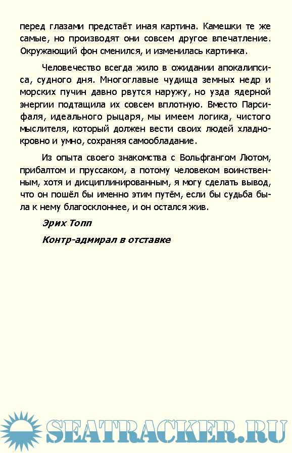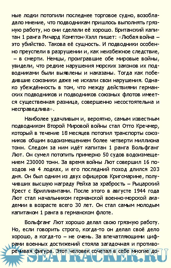 Описание: В книге представлена биография второго по результативности подводника Кригсмарине Вольфганга Люта, который мало известен за пределами Германии. И не удивительно – Лют нарастил свой счёт не в суровых водах Северной Атлантики, а гораздо южнее, имея дело с противником, мало способным оказать сопротивление, причём весьма значительную часть его жертв составили нейтральные суда. То есть его мастерство из количества потопленного тоннажа совершенно не очевидно. Тем не менее, американский военный моряк Джордан Воуз не скрывает своей симпатии к фашистскому подводнику, живописуя его «подвиги» иногда в таком святочно-сусальном стиле, что не замечает многих допущенных «по теме» грубых ошибок. Однако книга несколько приоткрывает картину «войны за тоннаж», которую вели немецкие подводники на отдалённых театрах Второй Мировой, и потому представляет собою определённую ценность.
