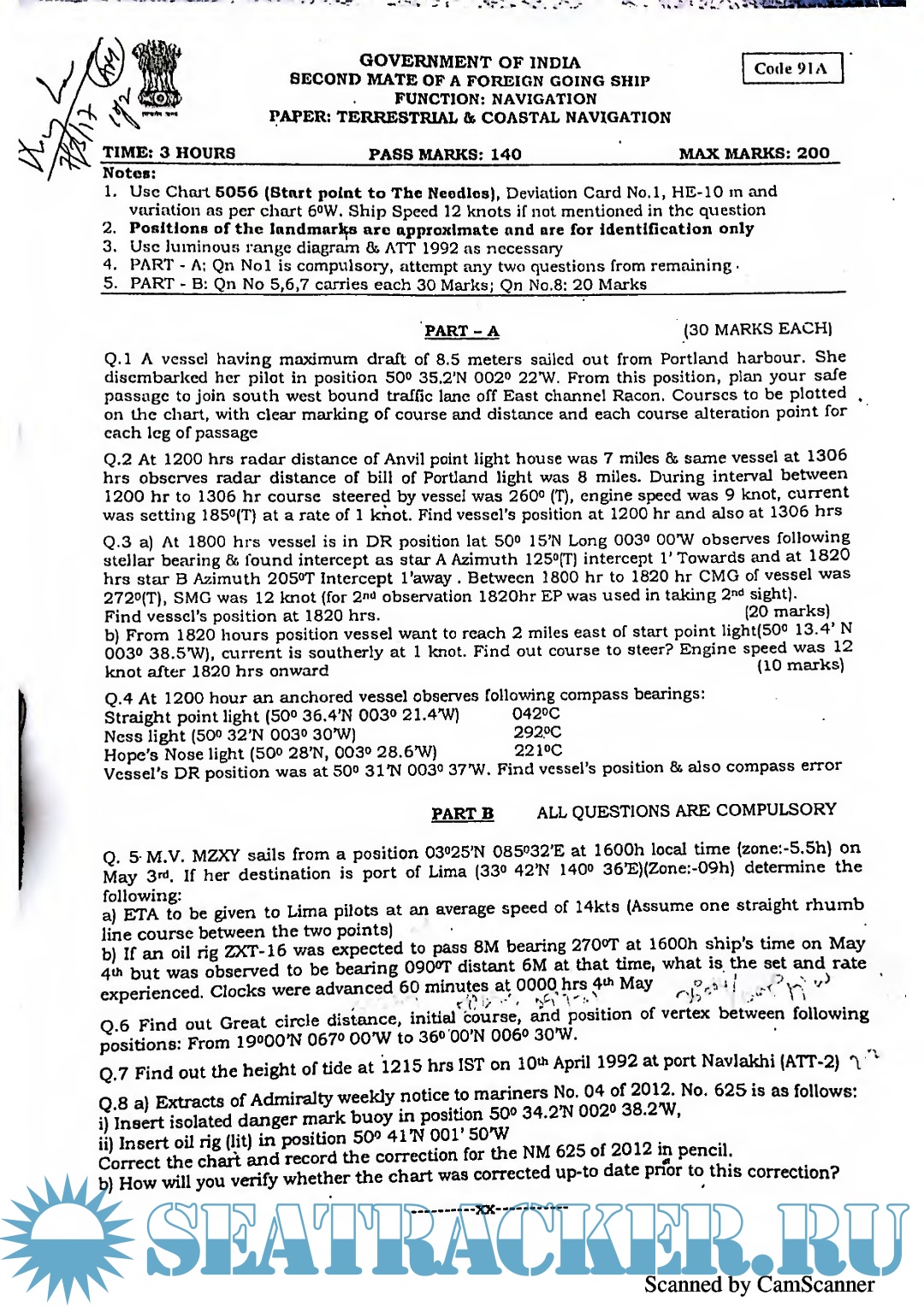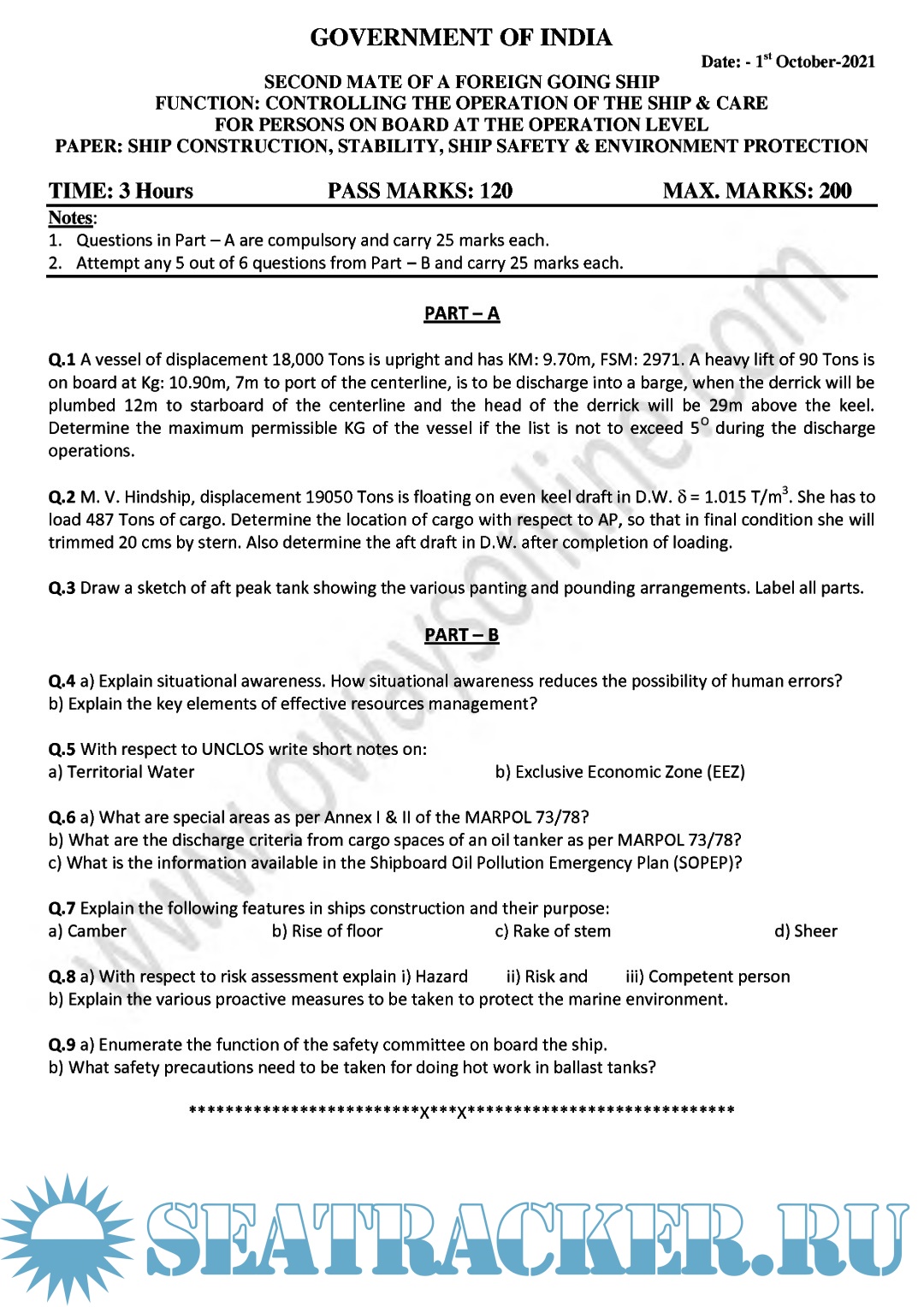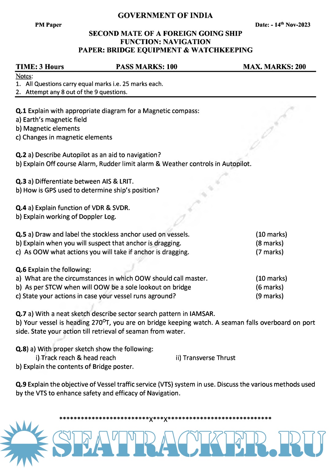 Question Paper Set (November 2023) for Second Mate (F.G.) Mercantile Marine Department (MMD), India Examinations