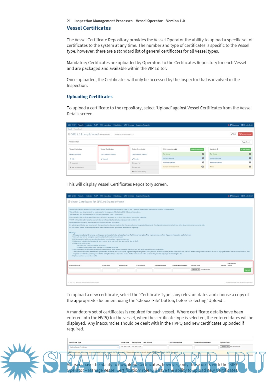 Description: This booklet guides Operator to manage SIRE 2.0 Inspection Management Processes including requesting for inspection, uploading defects along with picture and rectification, certificates etc.