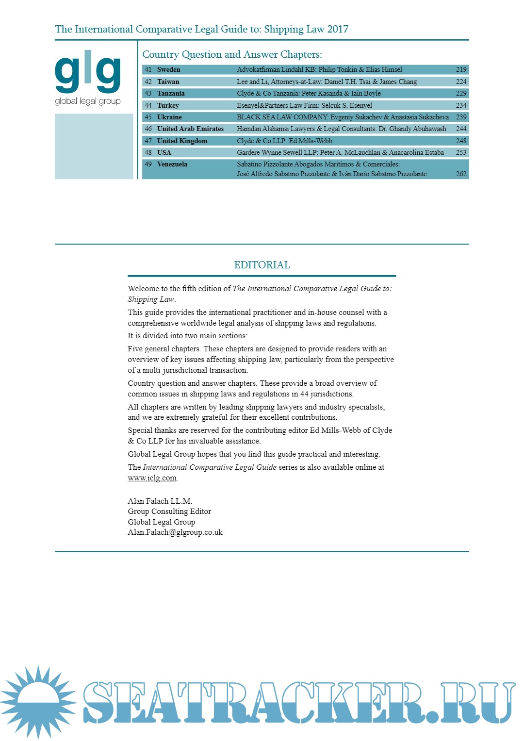 Year: 2017 Language: English Author: Global Legal Group Genre: Practical guide Publisher: Global Legal Group Edition: 5th ISBN: 978-1-911367-65-9 Format: PDF Quality: eBook Pages count: 274 Description: This guide provides the international practitioner and in-house counsel with a comprehensive worldwide legal analysis of shipping laws and regulations. It is divided into two main sections: Five general chapters. These chapters are designed to provide readers with an overview of key issues affecting shipping law, particularly from the perspective of a multi-jurisdictional transaction. Country question and answer chapters. These provide a broad overview of common issues in shipping laws and regulations in 44 jurisdictions. All chapters are written by leading shipping lawyers and industry specialists, and we are extremely grateful for their excellent contributions. Special thanks are reserved for the contributing editor Ed Mills-Webb of Clyde & Co LLP for his invaluable assistance. Global Legal Group hopes that you find this guide practical and interesting.