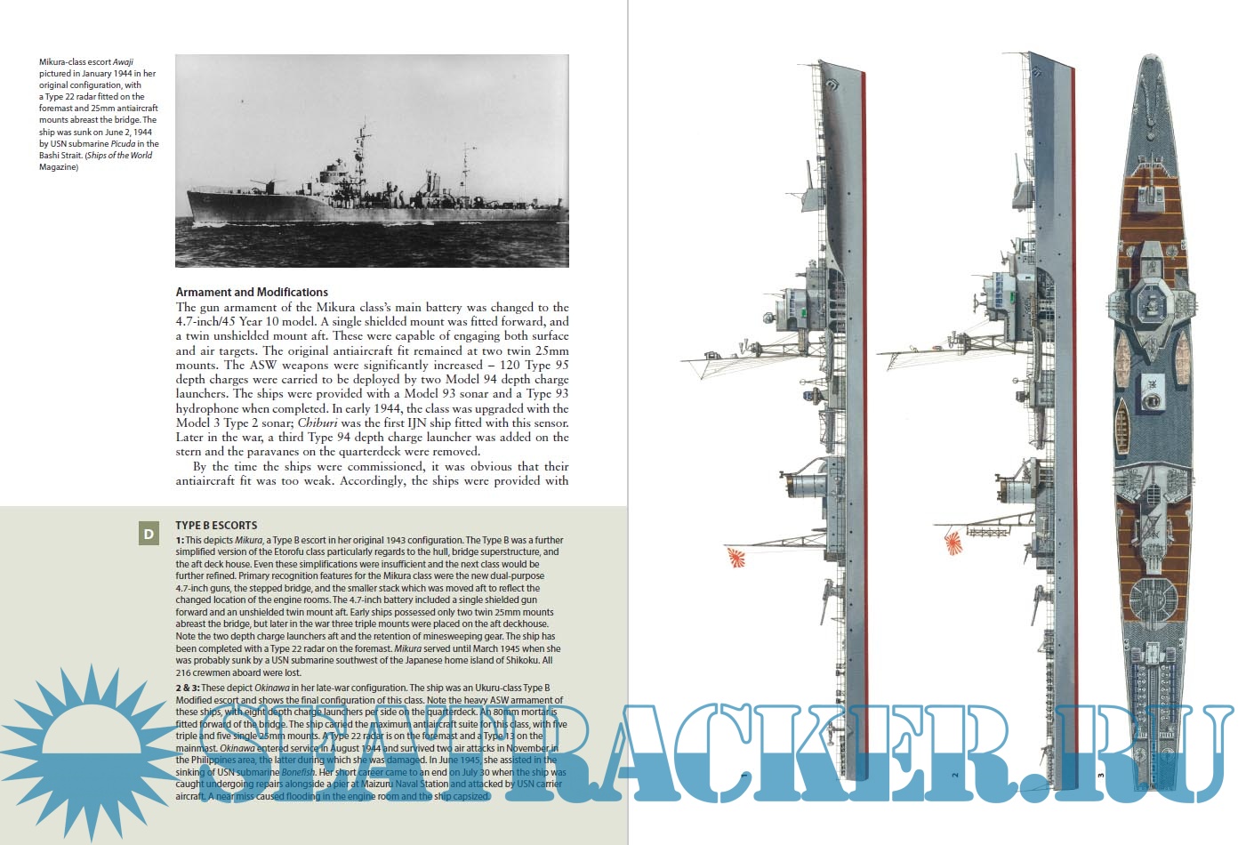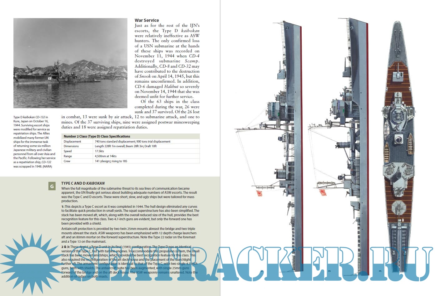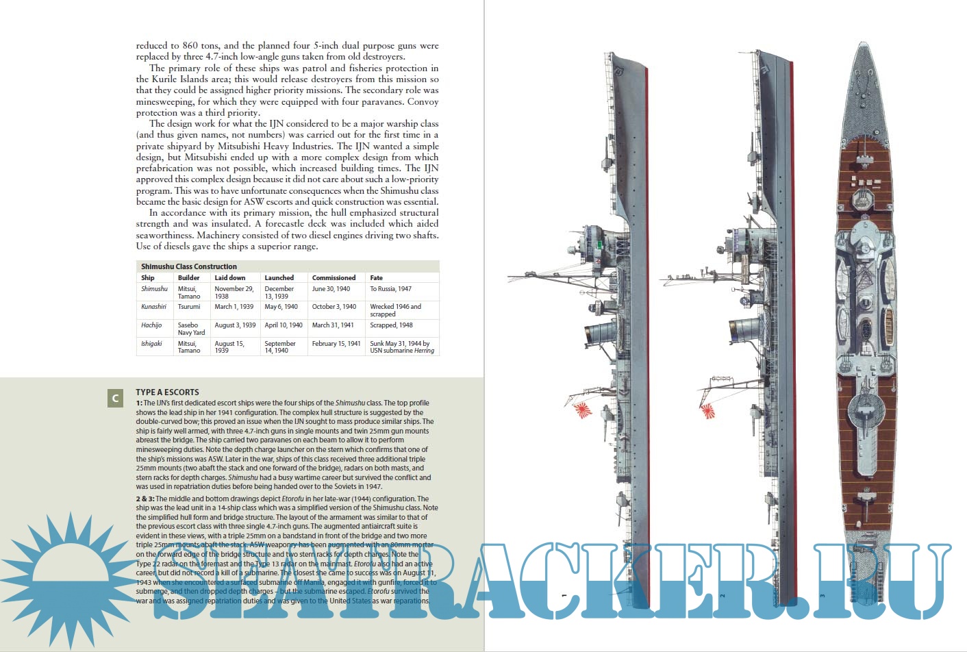 In this book author Mark Stille describes the belated Japanese efforts to design and produce escort vessels to counter the U.S. submarine threat and protect their merchant fleet. The Japanese developed several related ship classes with progressive increases in ASW weaponry and efforts were made to simplify the designs in order to reduce construction times. When US carrier and land based air power became a serious threat during the last year of the war, the ships were refitted with increased anti aircraft batteries. The book describes the construction of each class and lists the fate of each vessel. Illustrations are clear and well presented to show the differences between the classes.