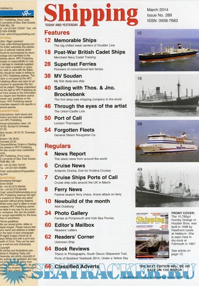 Year: 2014 Language: English Author: Nigel Lawrence (Editor) Genre: Periodical (magazine) Edition: 2014-03 Format: PDF Quality: Scanned pages Pages count: 66 Description: Shipping T&Y is a monthly magazine for the shipping enthusiast offering up-to-date information, topical and in-depth historical articles alongside images, many of which are exclusive to the magazine.Shipping Today & Yesterday is a specialist magazine for the shipping enthusiast offering up-to-date information, topical and in-depth historical articles.Shipping Today & Yesterday was first produced in March 1990 by, the then Editor and Publisher, John Young. The first edition stated that it would, “offer a news service covering important developments in the Shipping industry Today and will look back at ships and events of Yesterday, with regular features on merchant ships