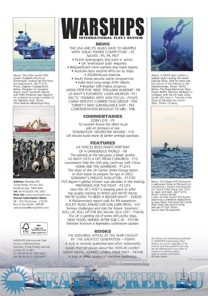 Description: Warships IFR puts the spotlight on the latest developments in the world’s navies. It covers current defence issues and has comments by leading analysts. The magazine regularly includes features on the Royal Navy and the US Navy in addition to incorporating news and features on all other navies across the globe. Warships IFR frequently carries in-depth articles on naval heritage.WARSHIPS International Fleet Review is published 12 times a year by Tandy Media Ltd who also publish Shipping Today & Yesterday (which provides news and features from the world of merchant shipping).