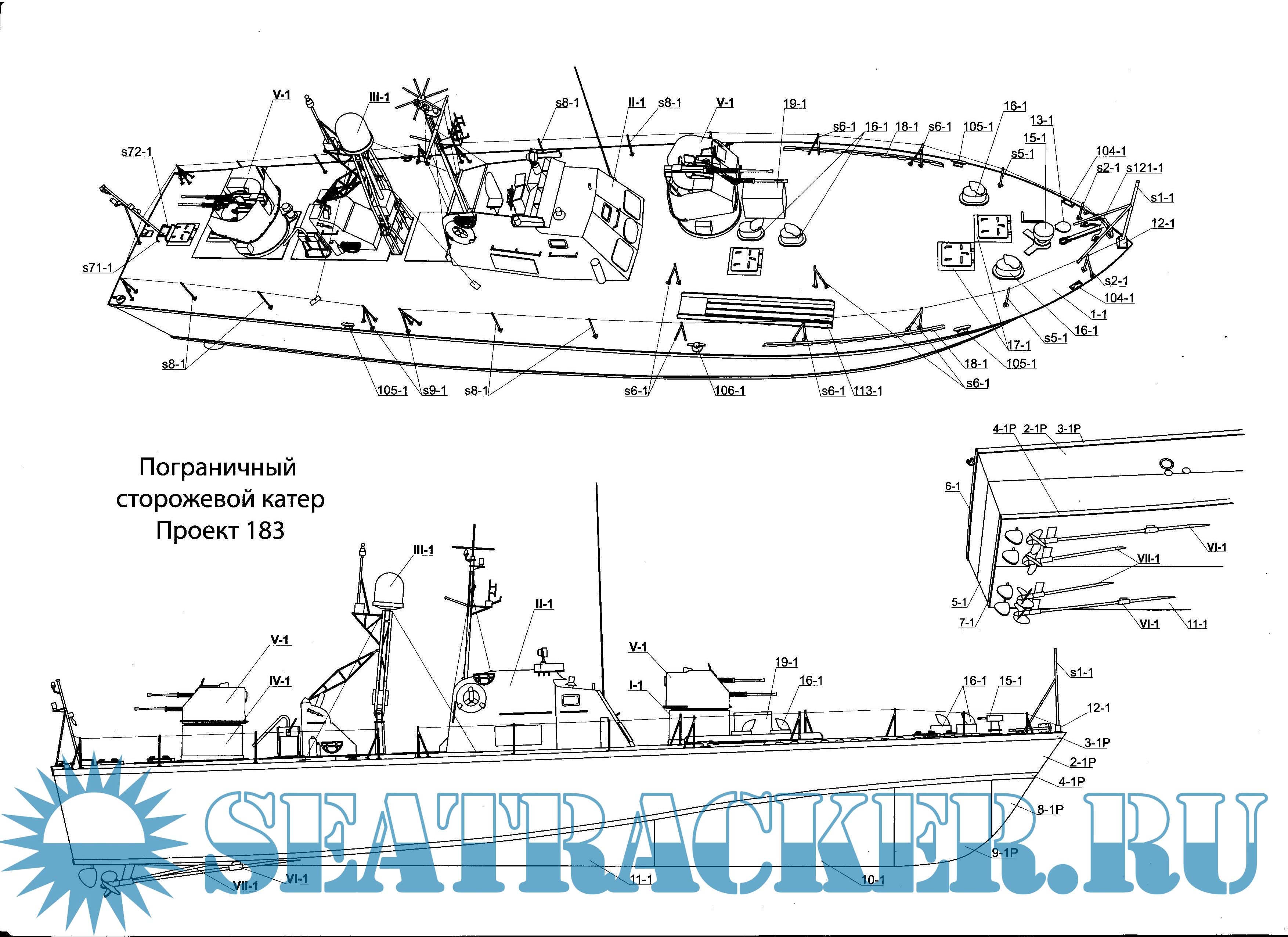 23 листа цветных выкроек и инструкций для изготовления бумажной модели большого торпедного катера или пограничного катера проекта 183 или катера-цели проекта 183Ц (шифр "Большевик") в масштабе 1:100