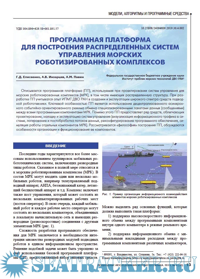 СОДЕРЖАНИЕ СИСТЕМЫ, ТЕХНОЛОГИИ И ЭКСПЕРИМЕНТЫ 4 Коноплин А.Ю., Денисов В.А., Даутова Т.Н., Кузнецов А.Л., Московцева А.В. Технология использования ТНПА для комплексного исследования глубоководных экосистем МОДЕЛИ, АЛГОРИТМЫ И ПРОГРАММНЫЕ СРЕДСТВА 13 Елисеенко Г.Д., Инзарцев А.В., Павин А.М. Программная платформа для построения распределенных систем управления морских роботизированных комплексов 21 Спорышев М.С., Щербатюк А.Ф. О некоторых алгоритмах решения задачи патрулирования подводной среды с помощью группы взаимодействующих АНПА 27 Ваулин Ю.В., Дубровин Ф.С., Щербатюк Д.А., Щербатюк А.Ф. О методах обеспечения навигации групп АНПА: краткий обзор СРЕДСТВА И МЕТОДЫ ПОДВОДНЫХ ИССЛЕДОВАНИЙ 37 Касаткин Б.А., Злобина Н.В., Касаткин С.Б. Пограничные волны в проблеме обнаружения подводных источников шума 49 Кузькин В.М., Матвиенко Ю.В., Переселков С.А. Применение интерферометрической обработки для локализации малошумных источников звука 58 Хворостов Ю.А., Матвиенко Ю.В. Характеристики собственного шумоизлучения малогабаритного АНПА 64 Захаров А.Н., Белобловский В.Н., Полищук С.В. Определение спектрального состава подводного шума движителя необитаемого подводного аппарата 71 Рефераты