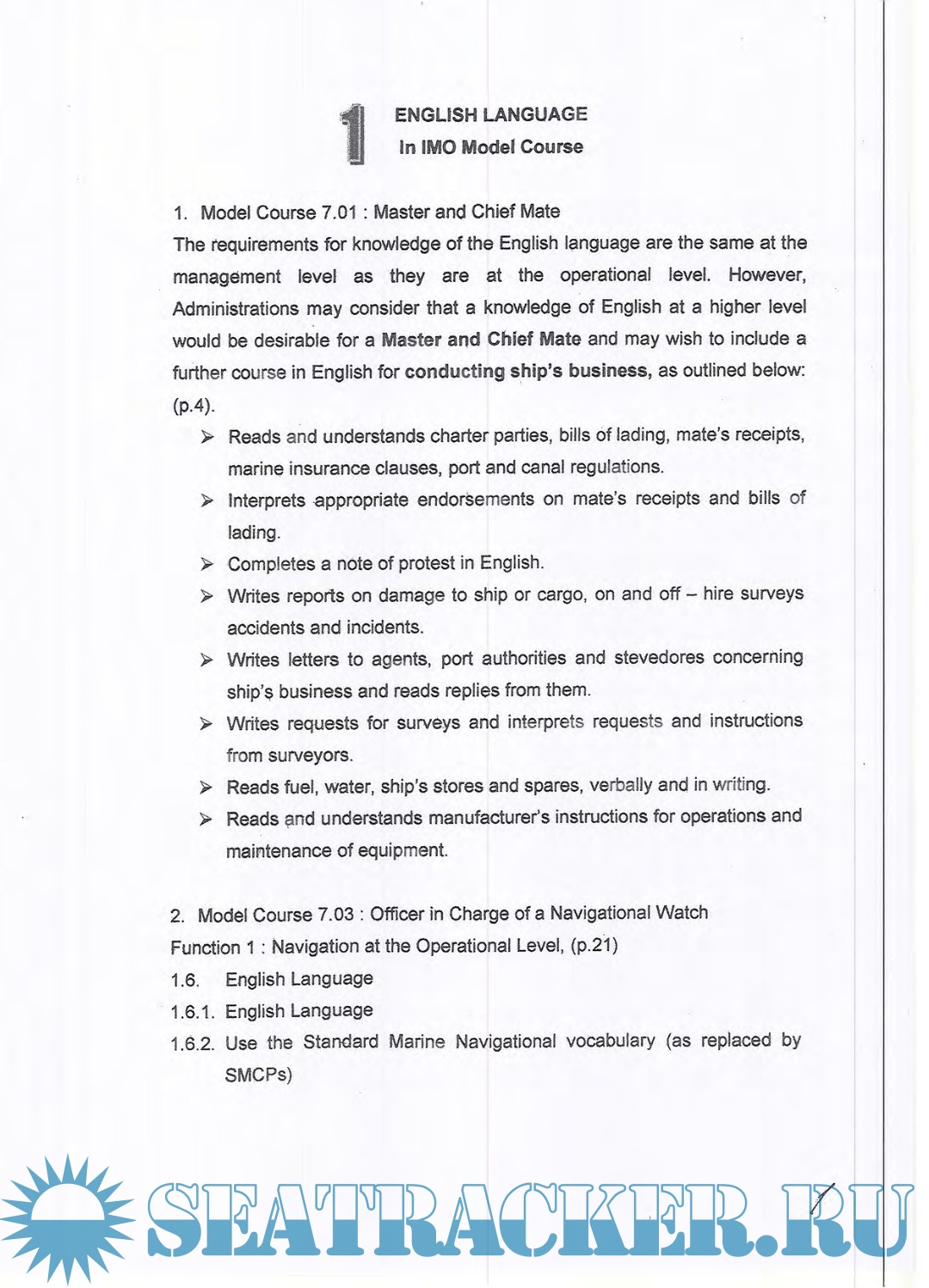 Description: The requirements for knowledge of the English language are the same at the management level as they are at the operational level. However, Administrations may consider that a knowledge of English at a higher level would be desirable for a Master and Chief Mate and may wish to include a further course in English for conducting ship’s business, as outlined below: (P-4).