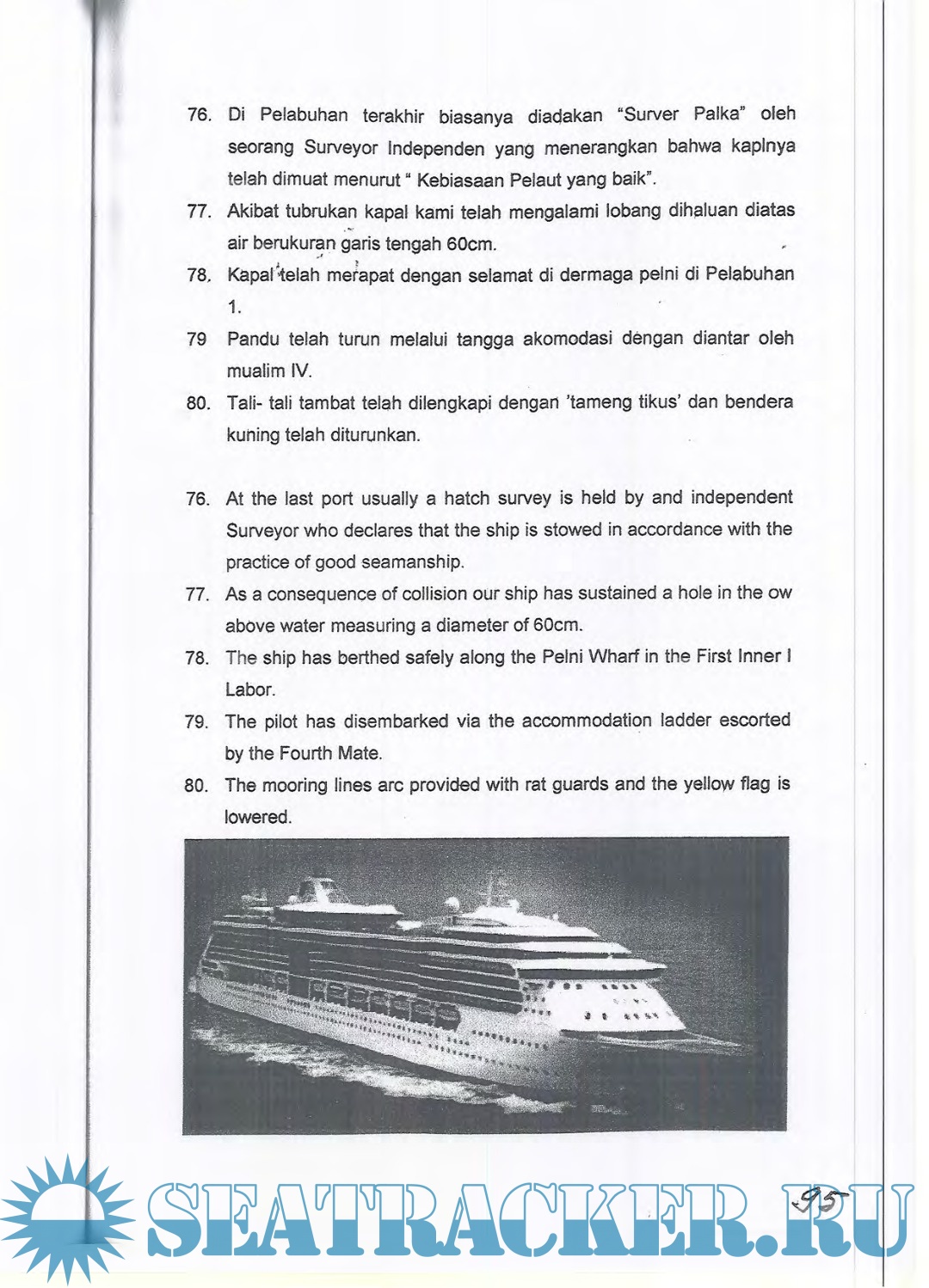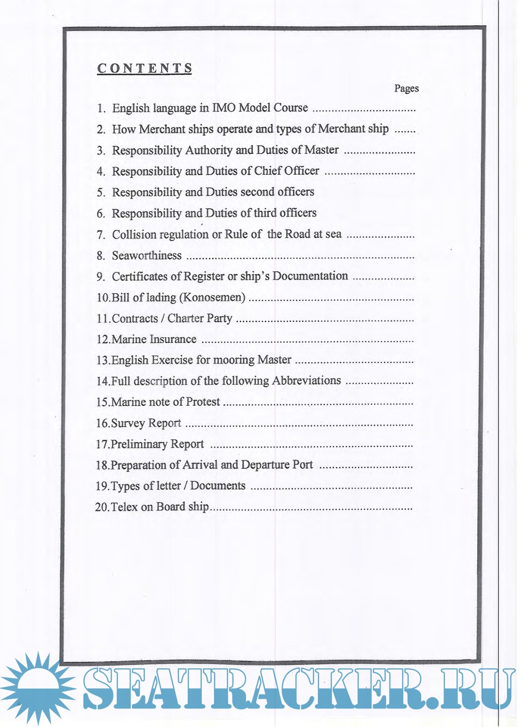 Year: 2011 Language: English Author: Capt. EW. Manikome M. MAR Genre: Textbook Edition: 1 Format: PDF Quality: Scanned pages Pages count: 186 Description: The requirements for knowledge of the English language are the same at the management level as they are at the operational level. However, Administrations may consider that a knowledge of English at a higher level would be desirable for a Master and Chief Mate and may wish to include a further course in English for conducting ship’s business, as outlined below: (P-4). > Reads and understands charter parties, bills of lading, mate’s receipts, marine insurance clauses, port and canal regulations. > Interprets appropriate endorsements on mate’s receipts and bills of lading. > Completes a note of protest in English. > Writes reports on damage to ship or cargo, on and off - hire surveys accidents and incidents. > Writes letters to agents, port authorities and stevedores concerning ship’s business and reads replies from them. > Writes requests for surveys and interprets requests and instructions from surveyors. > Reads fuel, water, ship's stores and spares, verbally and in writing. > Reads and understands manufacturer’s instructions for operations and maintenance of equipment. A new IMO Model Course on Maritime English will be based on a clearly defined entry standard in general English, deals with maritime terminology and the use of English for the purposes of using charts and other nautical publications, understanding meteorological information and communicating with other ships or coast stations concerning ship’s safety and operation, including the use of the IMO Standard Marine Navigational Vocabulary, as replaced by the IMO Standard Marine Communication Phrases (SMC Ps). The course also includes the vocabulary needed to make use of and understand manufacturer’s technical manuals and specifications to converse with technical shore staff concerning ship and machinery repairs.