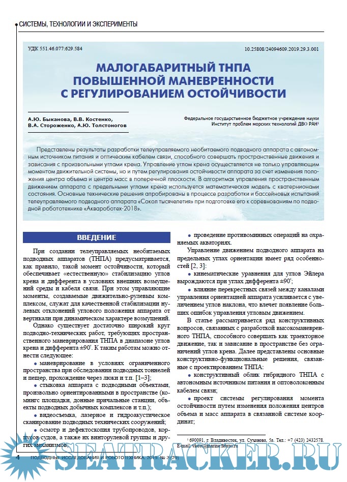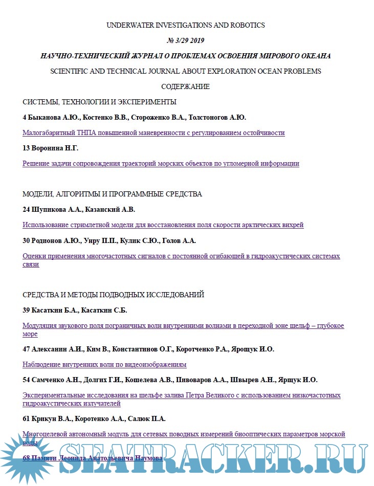 Описание: Научно-технический журнал «Подводные исследования и робототехника» посвящен проблемам исследования и освоения Мирового океана и относится к области знаний, лежащей на стыке наук:- теоретической и прикладной механики, навигации и управления движением, динамики управляемых систем и процессов,- робототехники, мехатроники, автоматизированного конструирования технических устройств, информатики и вычислительной техники,- теоретической и прикладной океанографии, физики океана, гидроакустики, морской геологии, экологии морских акваторий.Цель журнала – систематизировать и объективно отражать все наиболее значимые научно-технические и практические достижения и результаты исследований по освоению подводного пространства и морского дна, способствовать развитию новых идей, средств и методов подводных исследований и робототехники, консолидировать усилия научных и деловых кругов, потенциальных потребителей новейших достижений в сфере подводных технологий.Журнал «Подводные исследования и робототехника» публикует научно-технические статьи, проблемные, обзорные, дискуссионные материалы по всем направлениям, относящимся к методам и техническим средствам исследования и освоения океана, включая подводные аппараты и роботы, акустические, гидрологические, геофизические средства и методы исследования физических полей океана.Авторами публикаций журнала являются авторитетные ученые, ведущие специалисты и молодые исследователи из научных организаций и вузов Москвы и Подмосковья, Санкт-Петербурга, Зарубежья, Дальнего Востока, Урала, Сибири, и других регионов России. Для научного рецензирования и редактирования публикуемых статей привлекаются авторитетные специалисты в соответствующих областях знаний.Читательская аудитория - широкий круг ученых и специалистов, работающих в области исследования морских глубин, деловые круги и потенциальные потребители научно-технических разработок и инновационных проектов, молодые ученые, аспиранты и студенты, специализирующаяся в указанной области.