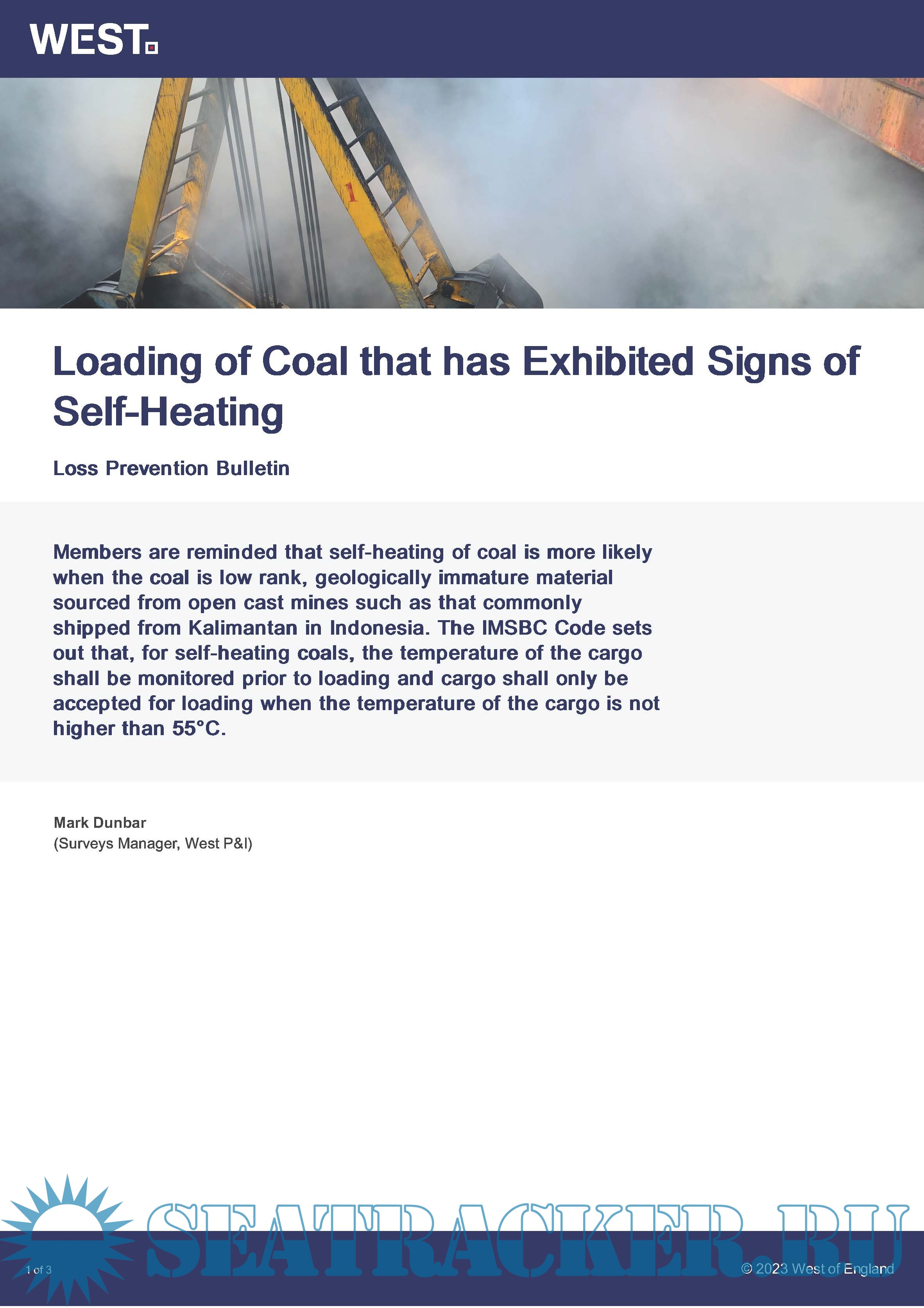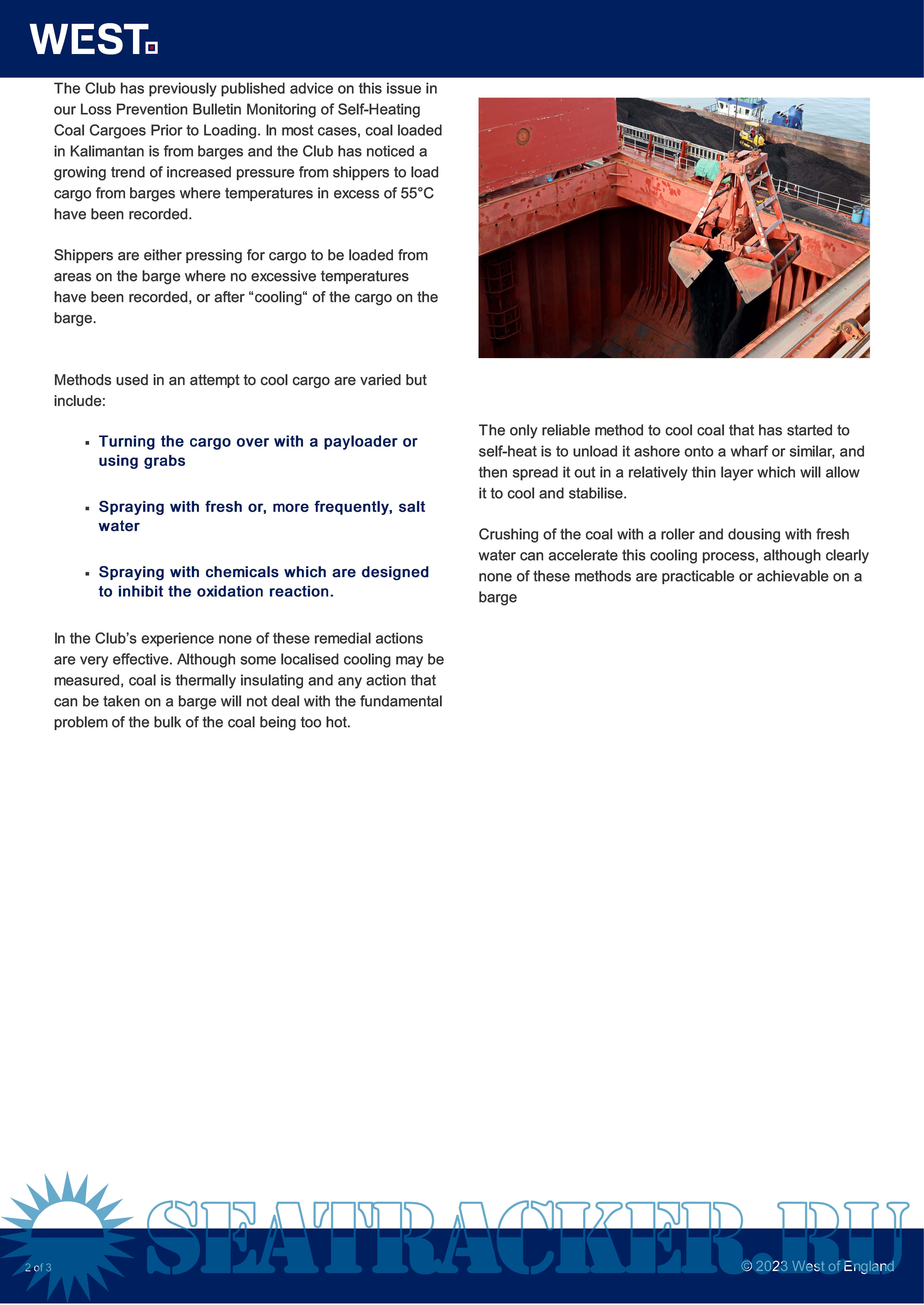 Year: 2023 Language: English Author: The West of England P&I Club Genre: Periodical Format: PDF Quality: eBook Pages count: 4 Description: Loss Prevention Bulletin Members are reminded that self-heating of coal is more likely when the coal is low rank, geologically immature material sourced from open cast mines such as that commonly shipped from Kalimantan in Indonesia. The IMSBC Code sets out that, for self-heating coals, the temperature of the cargo shall be monitored prior to loading and cargo shall only be accepted for loading when the temperature of the cargo is not higher than 55°C.