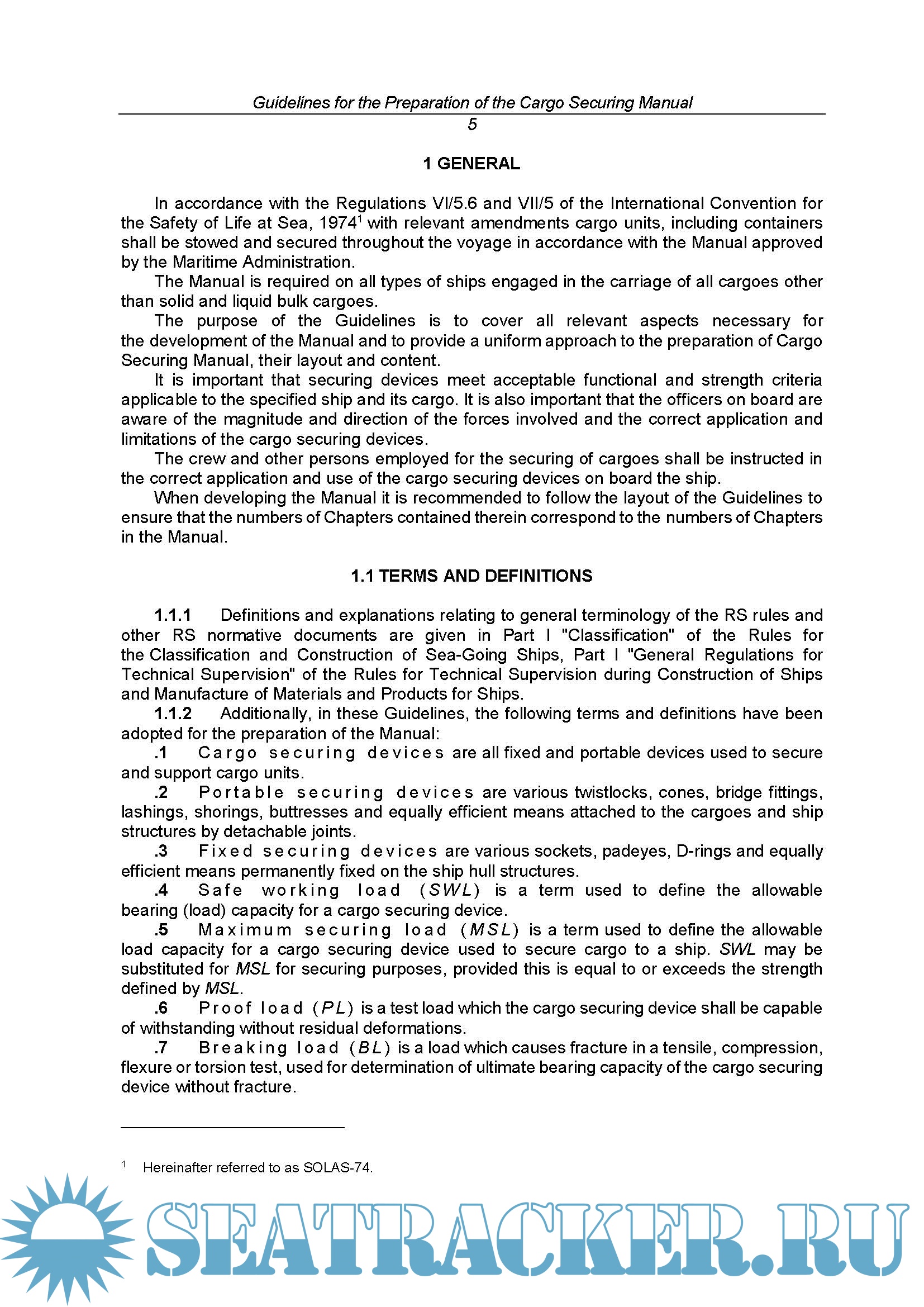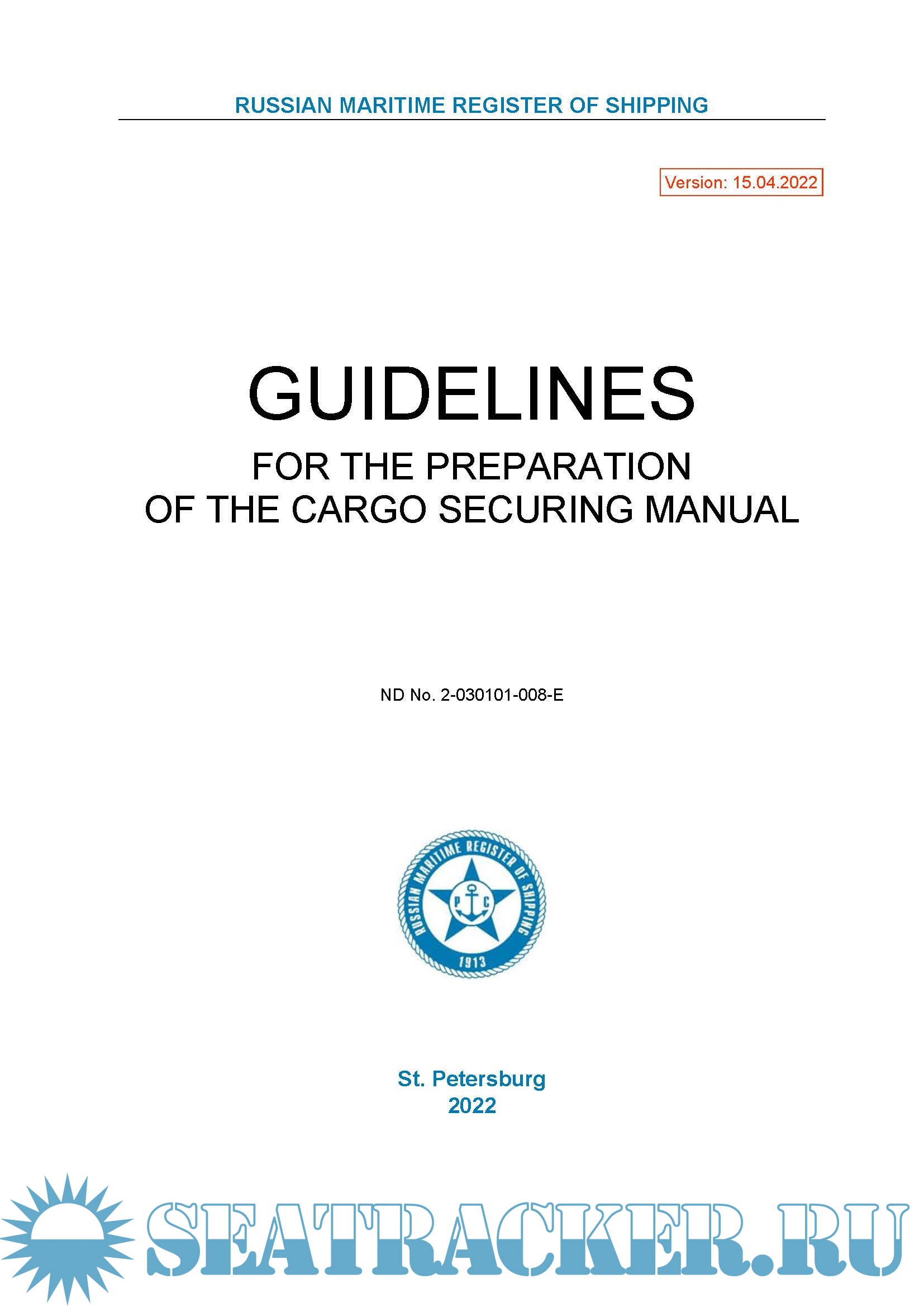 Description: The Guidelines for the Preparation of the Cargo Securing Manual1 determine the content as well as the procedure for agreement and approval of the Cargo Securing Manual for all ships carrying general cargoes and flying the flag of the Russian Federation and engaged in domestic and international voyages.