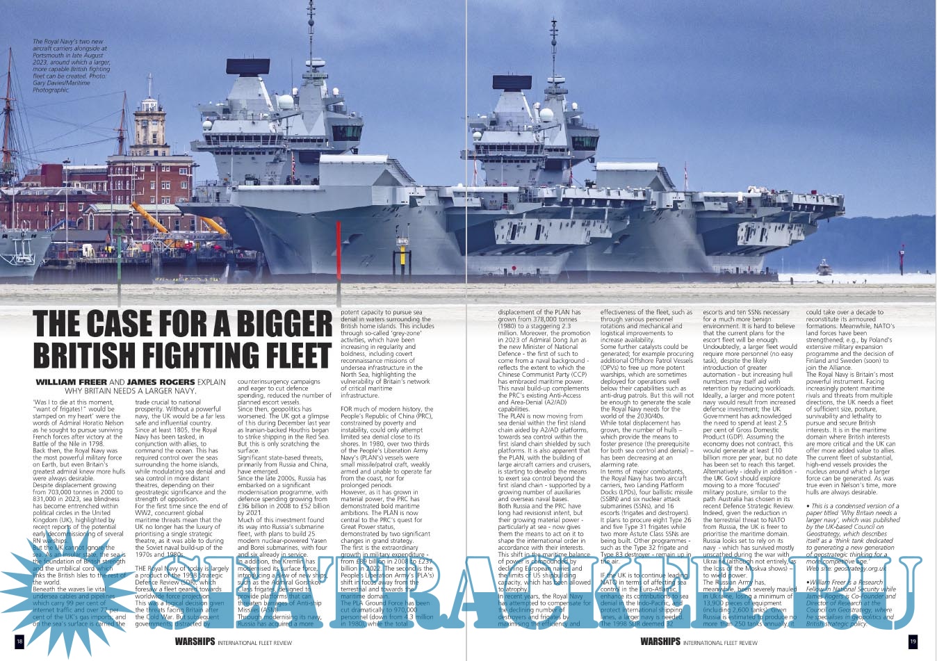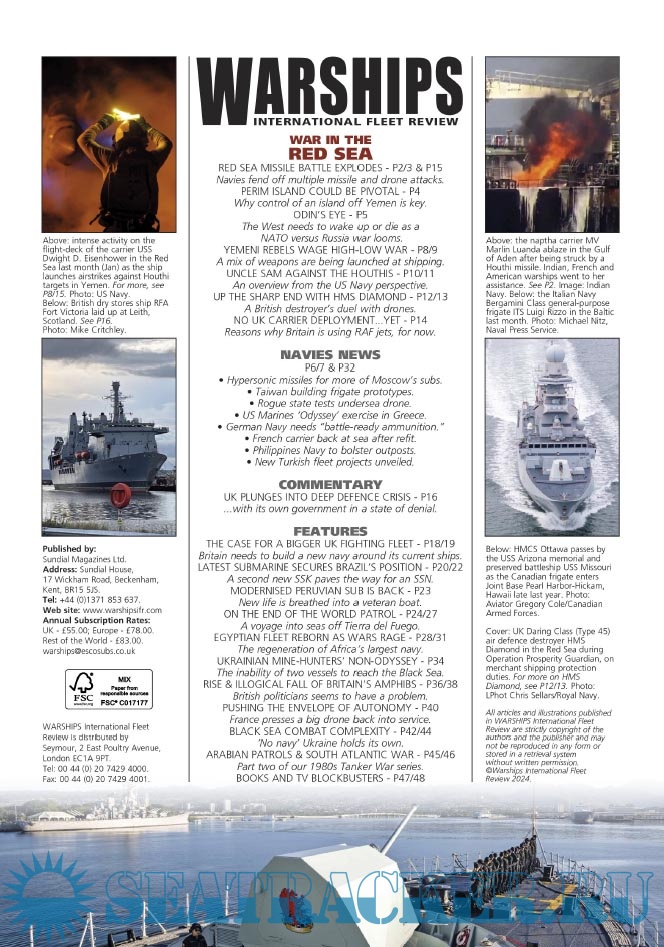 Description: Warships IFR puts the spotlight on the latest developments in the world’s navies. It covers current defence issues and has comments by leading analysts. The magazine regularly includes features on the Royal Navy and the US Navy in addition to incorporating news and features on all other navies across the globe. Warships IFR frequently carries in-depth articles on naval heritage.WARSHIPS International Fleet Review is published 12 times a year by Tandy Media Ltd who also publish Shipping Today & Yesterday (which provides news and features from the world of merchant shipping).