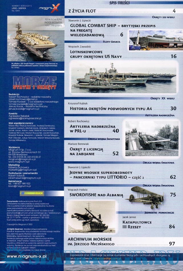 Description: Польский морской журнал. Издается с 1996 года, первоначально как ежеквартальный. С 1999 года издается раз в два месяца, а с 2007 года-как ежемесячный. Первоначально назывался Morza Statki i Okrety, в 2006 году переименован в Morze Statki i Okrety. С 2004 года полностью цветной (ранее только вставки). В 2008 году стали издаваться специальные выпуски, первоначально нерегулярные. С 2014 года выпускается как обычное издание и специальное издание, с непрерывной нумерацией.
