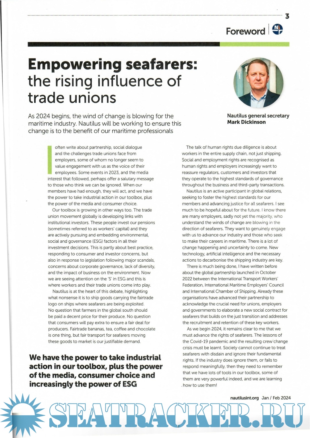 We have also been active in the inland waterways sector (pages 26-27), and the Union's campaign for a Just Transition for maritime workers was given a boost at the UN climate conference COP28 (pages 34-35). Governments will now be expected to ensure support for those impacted by the transition to new technology.