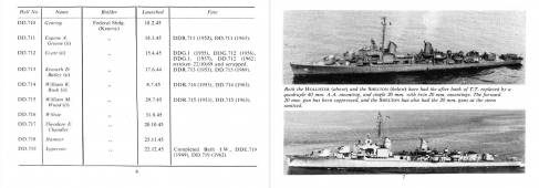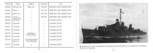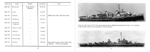 Description: This is a detailed listing of U.S. Navy destroyers that were available during World War II, with all cancelled and projected units. Includes information such as hull number, name of the vessel, builder, launched date, and fate (such as torpedoed at Guadalcanal and finally gunfire of Gwin). Photos of the ships and brief captions give the reader a clear overview.
