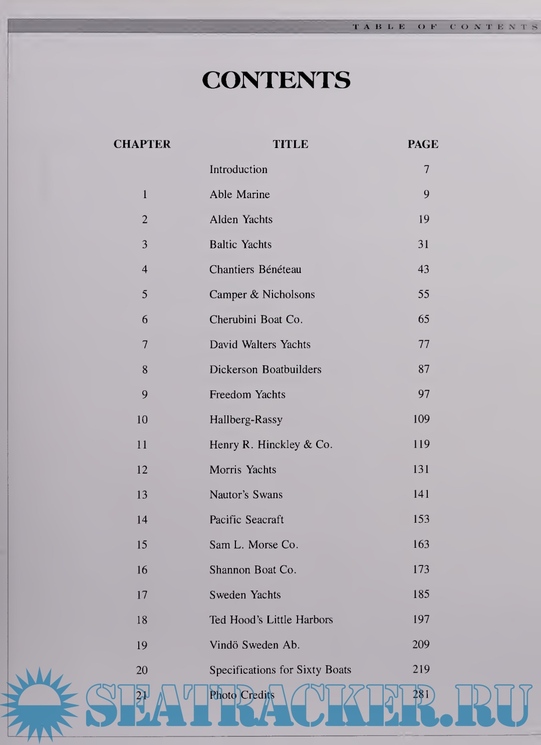 Description: Provides drawings and diagrams of yachts made by nineteen top boat builders, shows each yacht's interior design, and describes how sailboats are constructed