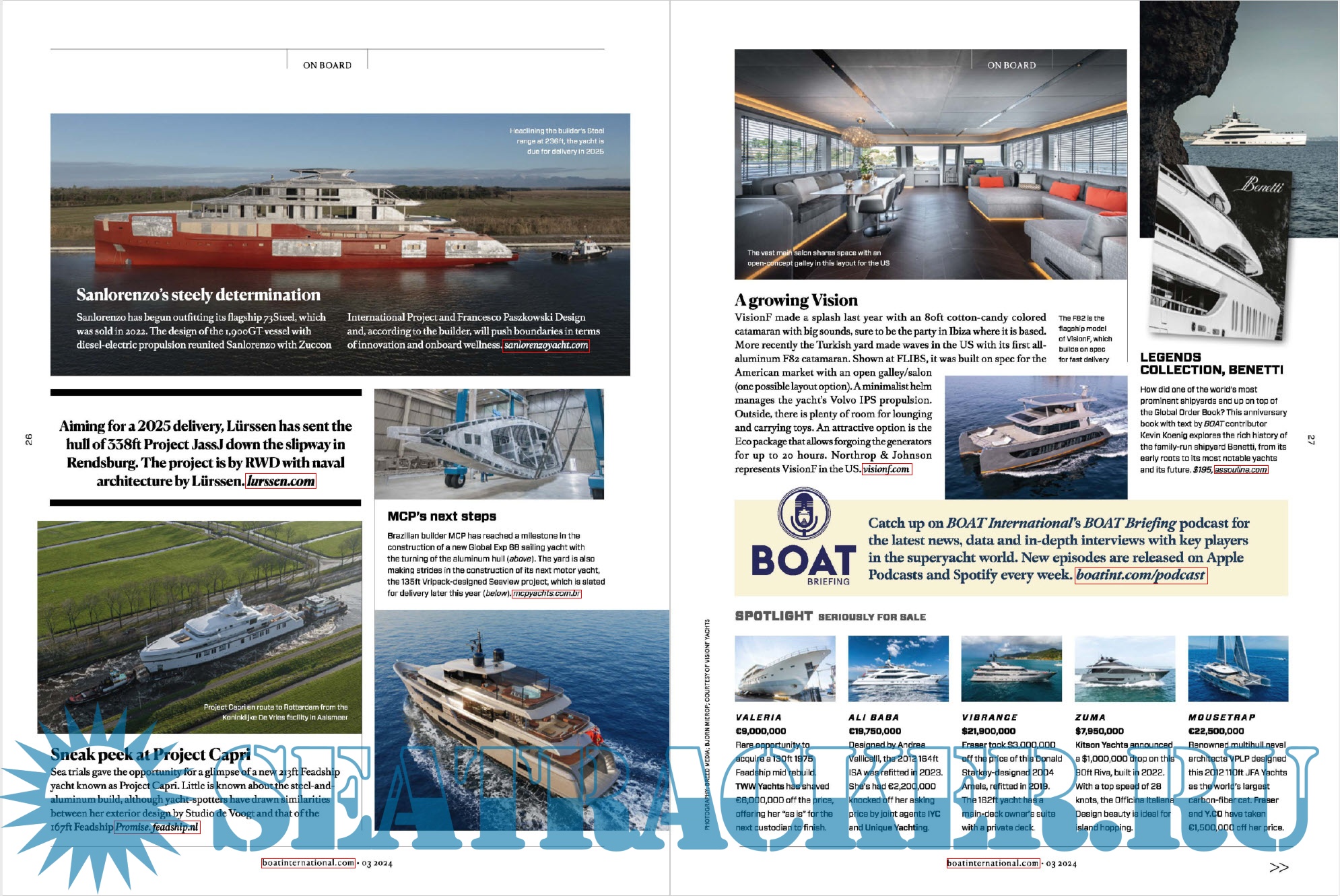 Year: 2024 Language: English Editor: Stewart Campbell Genre: Periodical (magazine) Edition: March 2024 Format: PDF Quality: eBook Pages count: 148 Description: Boat International is the number ONE magazine in the international superyacht market. Launched in 1983 it has been the voice of record charting the superyacht industry for over 25 years and is the globally acknowledged authority in its field. The world's only monthly superyacht magazine, Boat International delivers exclusive and unrivaled coverage of power and sail yachting from the world's best journalists and photographers.