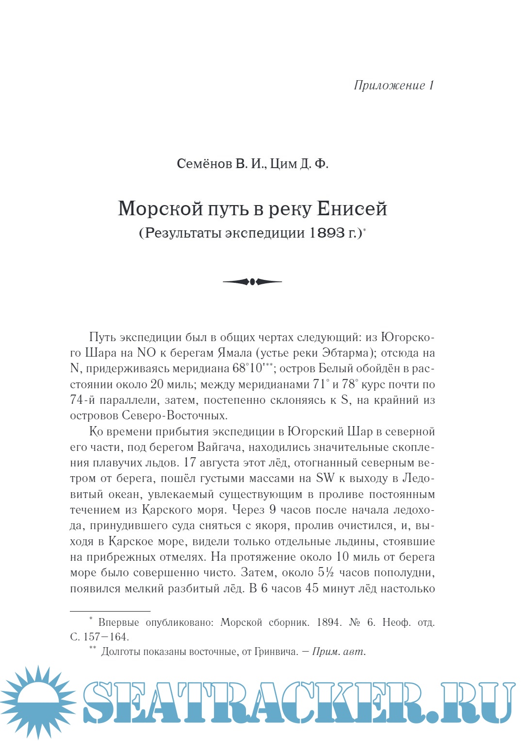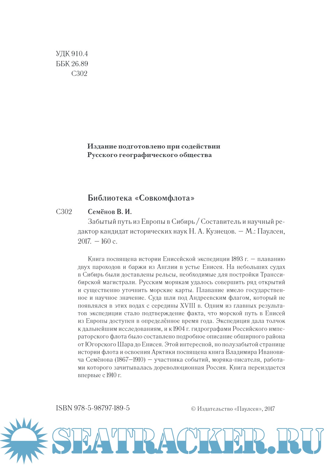 Описание: Книга посвящена истории Енисейской экспедиции 1893 г. – плаванию двух пароходов и баржи из Англии в устье Енисея. На небольших судах в Сибирь были доставлены рельсы, необходимые для постройки Транссибирской магистрали. Русским морякам удалось совершить ряд открытий и существенно уточнить морские карты. Плавание имело государственное и научное значение. Суда шли под Андреевским флагом, который не появлялся в этих водах с середины XVIII в. Одним из главных результатов экспедиции стало подтверждение факта, что морской путь в Енисей из Европы доступен в определённое время года. Экспедиция дала толчок к дальнейшим исследованиям, и к 1904 г. гидрографами Российского императорского флота было составлено подробное описание обширного района от Югорского Шара до Енисея. Этой интересной, но полузабытой странице истории флота и освоения Арктики посвящена книга Владимира Ивановича Семёнова (1867–1910) – участника событий, моряка-писателя, работами которого зачитывалась дореволюционная Россия. Книга переиздается впервые с 1910 г.