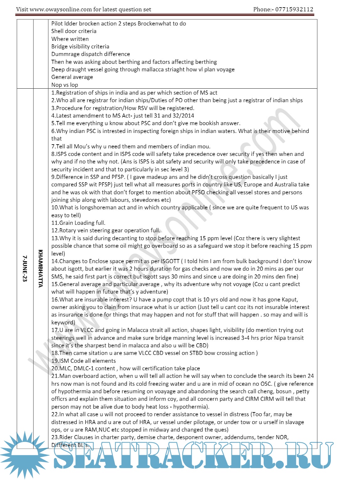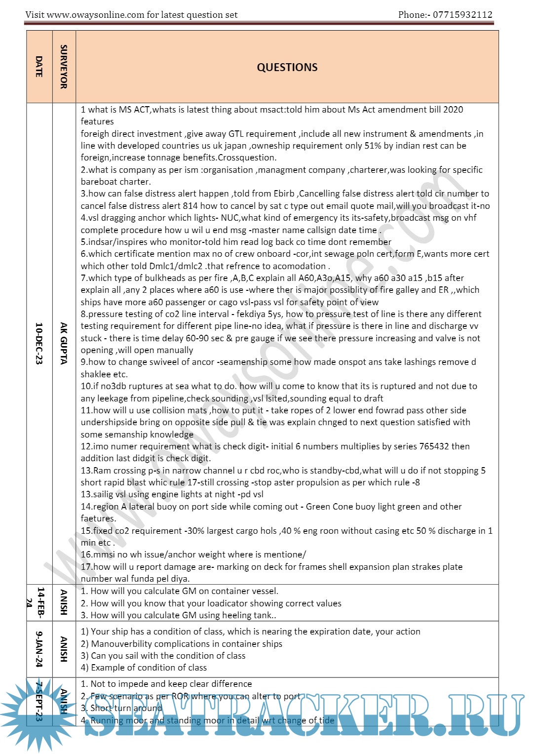 Orals Question Bank (February 2024) for ASM (Advanced Shipboard Management) / Master's Mercantile Marine Department (MMD), India Examinations