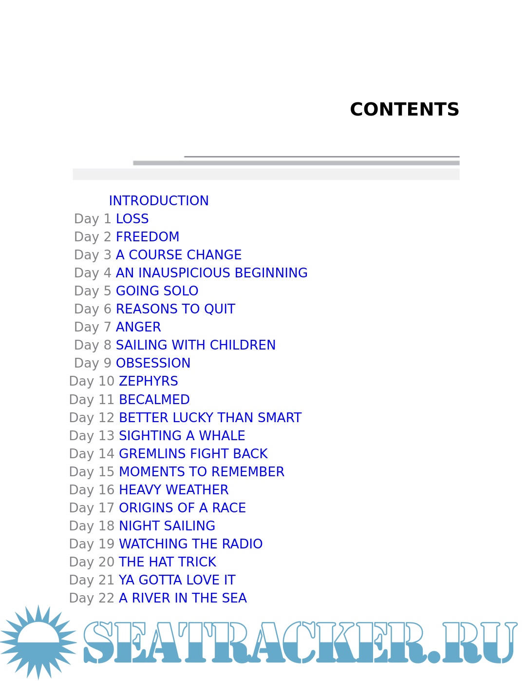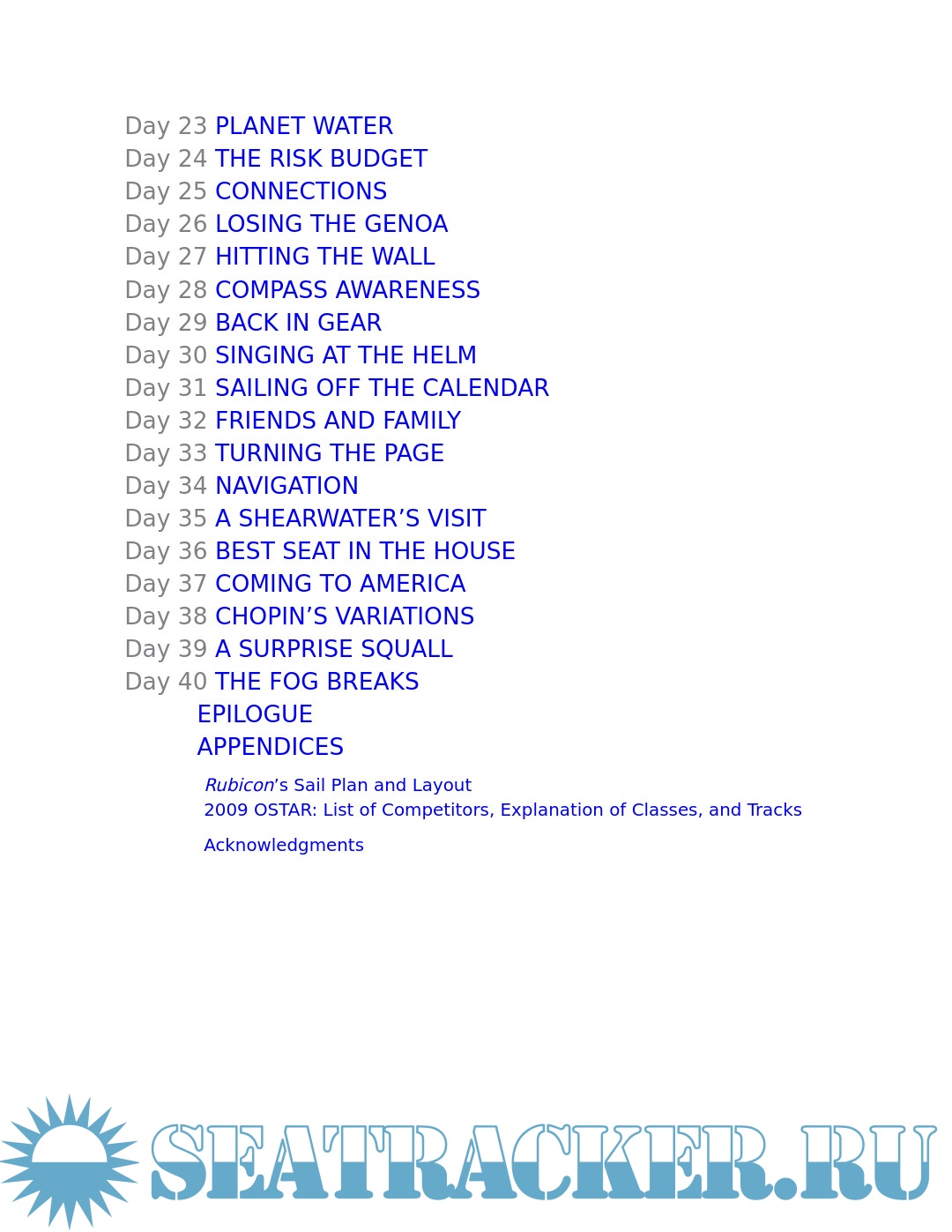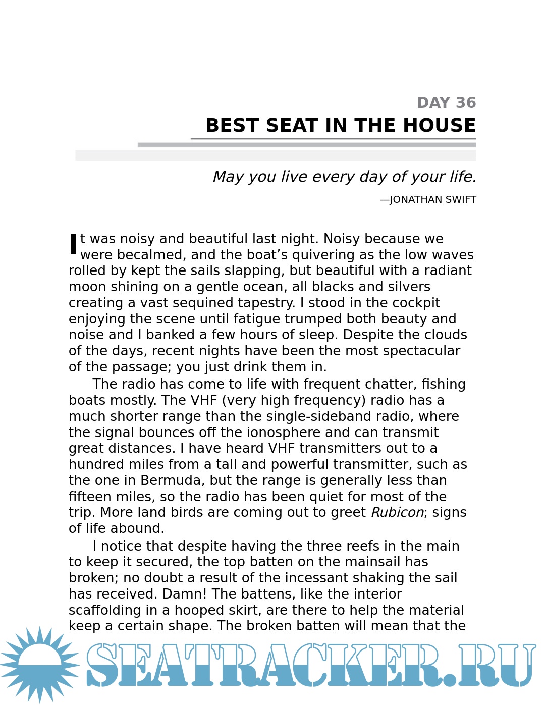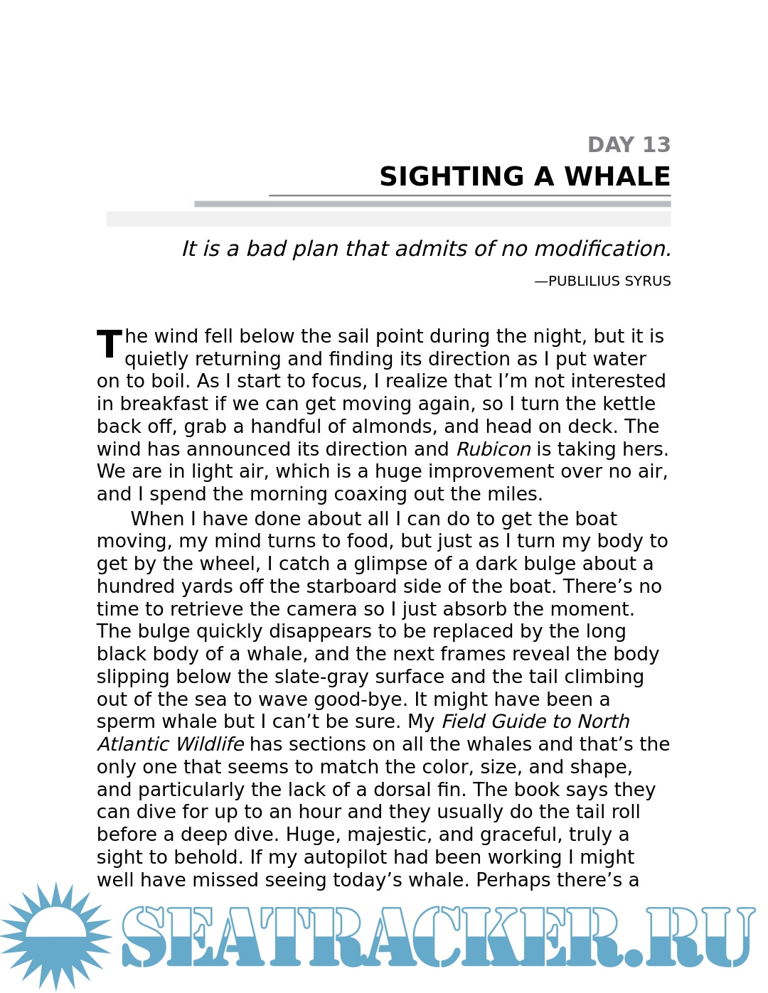 "Life and circumstance had left me working flat out trying to maintain my professional position, be a good father, and keep everything together. At the late-night end of many days, I found myself mumbling: 'I can't keep doing this, this is killing me, I'm dying.' It wasn't a question of wanting out of the parenting role, or the business role, but I needed a third ball for balance . . ." "To be at sea is to be in a different world, and to live alone for a time in this alien place can yield a spiritual calm. . . . In such a calm, order and perspective can enter your thoughts. Life can be harsh at sea, but it is never sordid. The simple necessities of food, drink, and sleep are received with gratitude, and always there is the sea's reminder that you are a speck of dust in the cosmos. The rush of thoughts slows, and order replaces the chaos as you consider your journey." -- From the book
