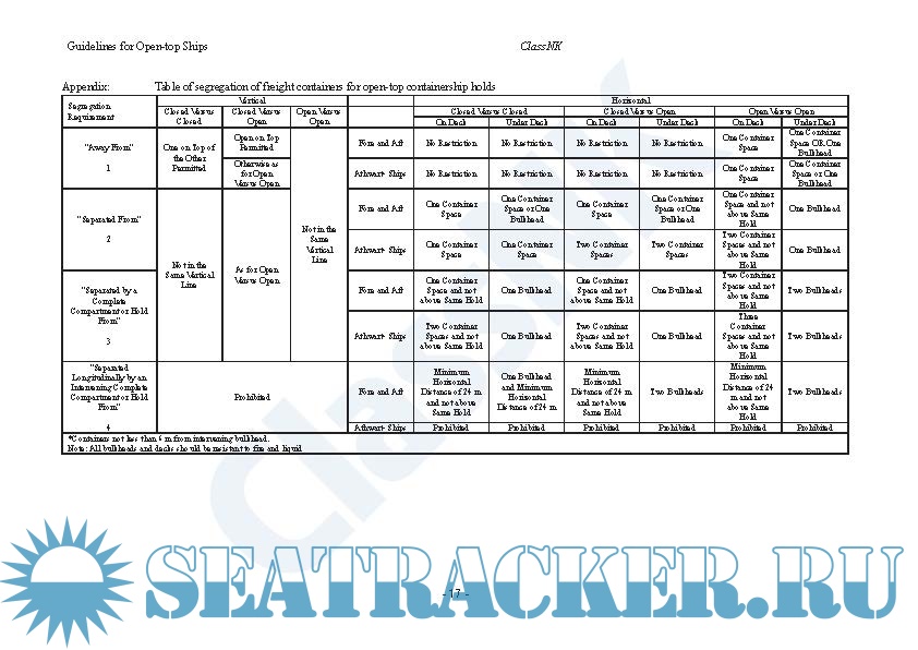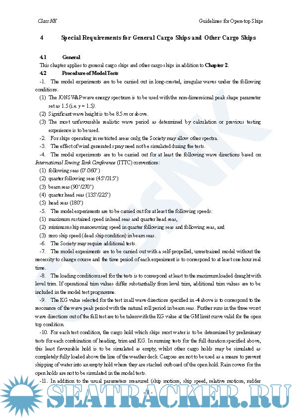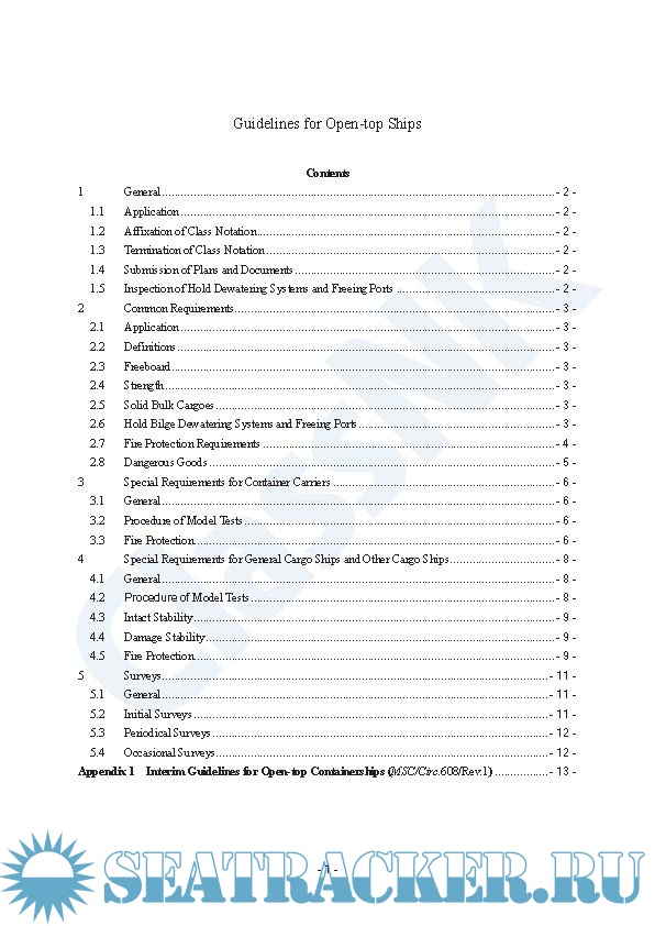 The IMO adopted the “Interim Guidelines for Open-top Containerships” (IMO circular MSC/Circ.608/Rev.1) in July 1994 to serve as its guideline for “open-top” containerships (i.e. container carriers with cargo holds not fitted with hatch covers) and it specifies requirements for model test procedures, hold bilge dewatering systems, fire-protection and other matters related to such ships.