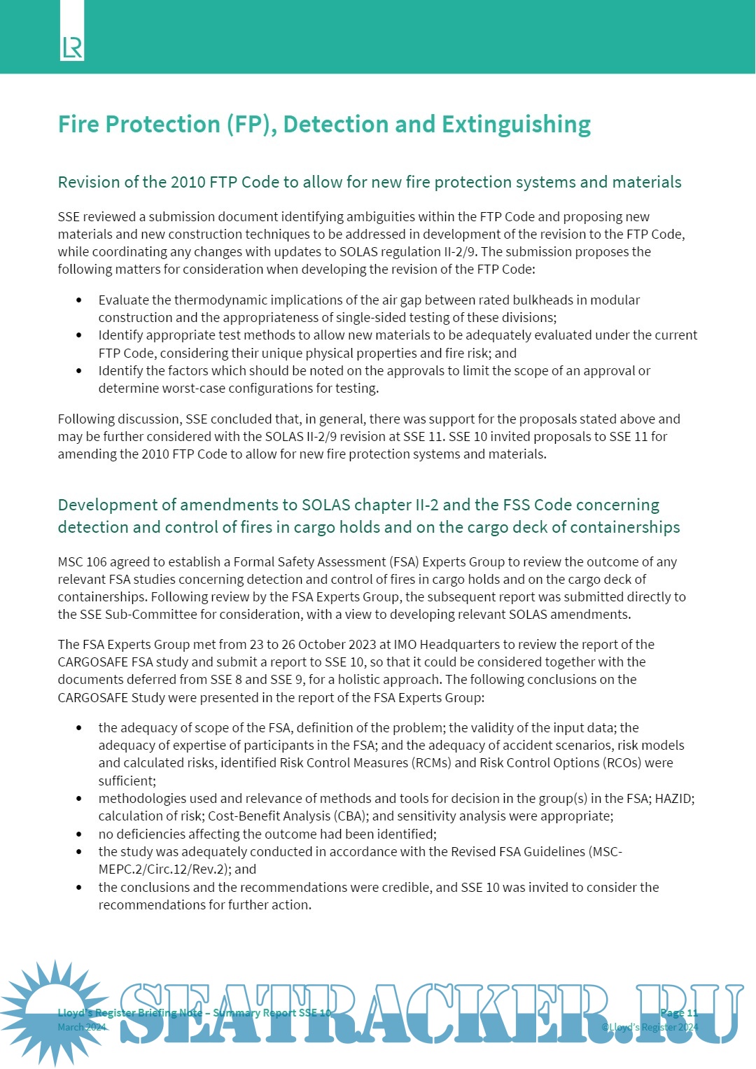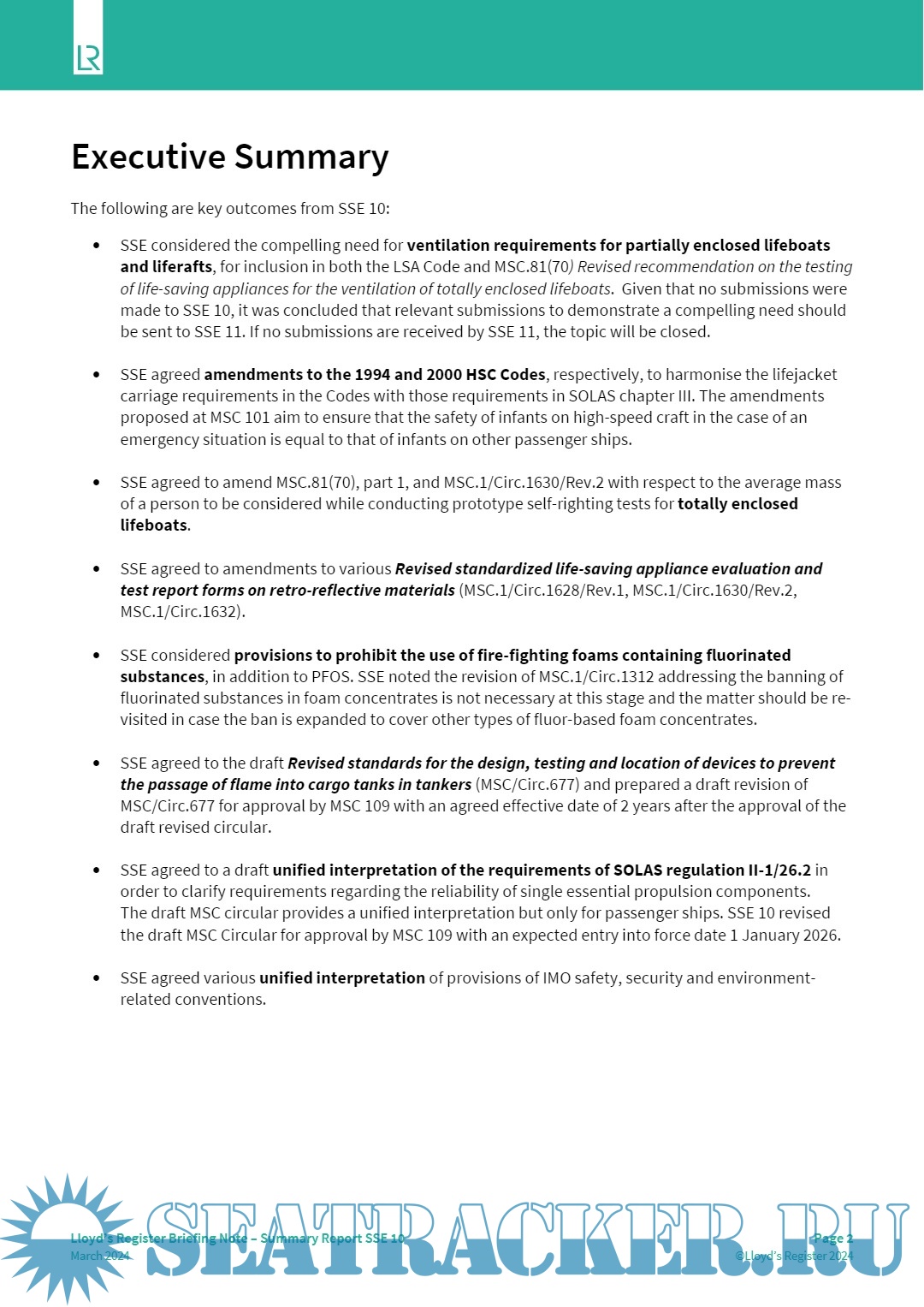 LR Summary Report for the IMO Ship Systems and Equipment Sub-Committee (SSE 10)