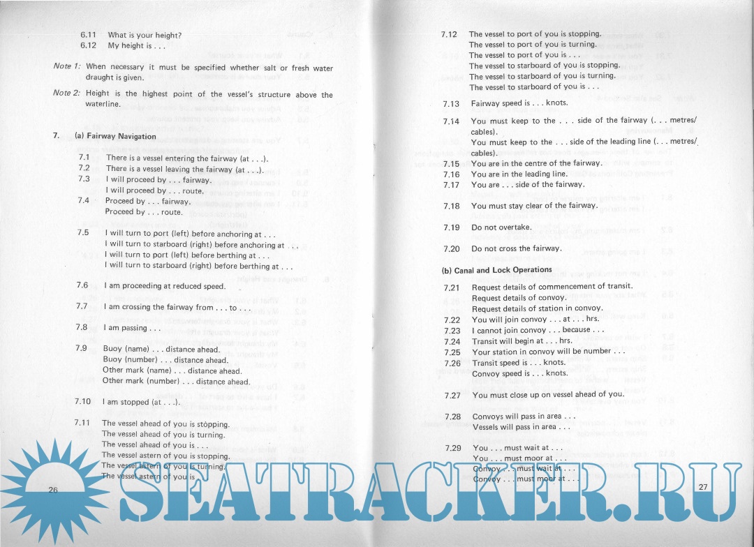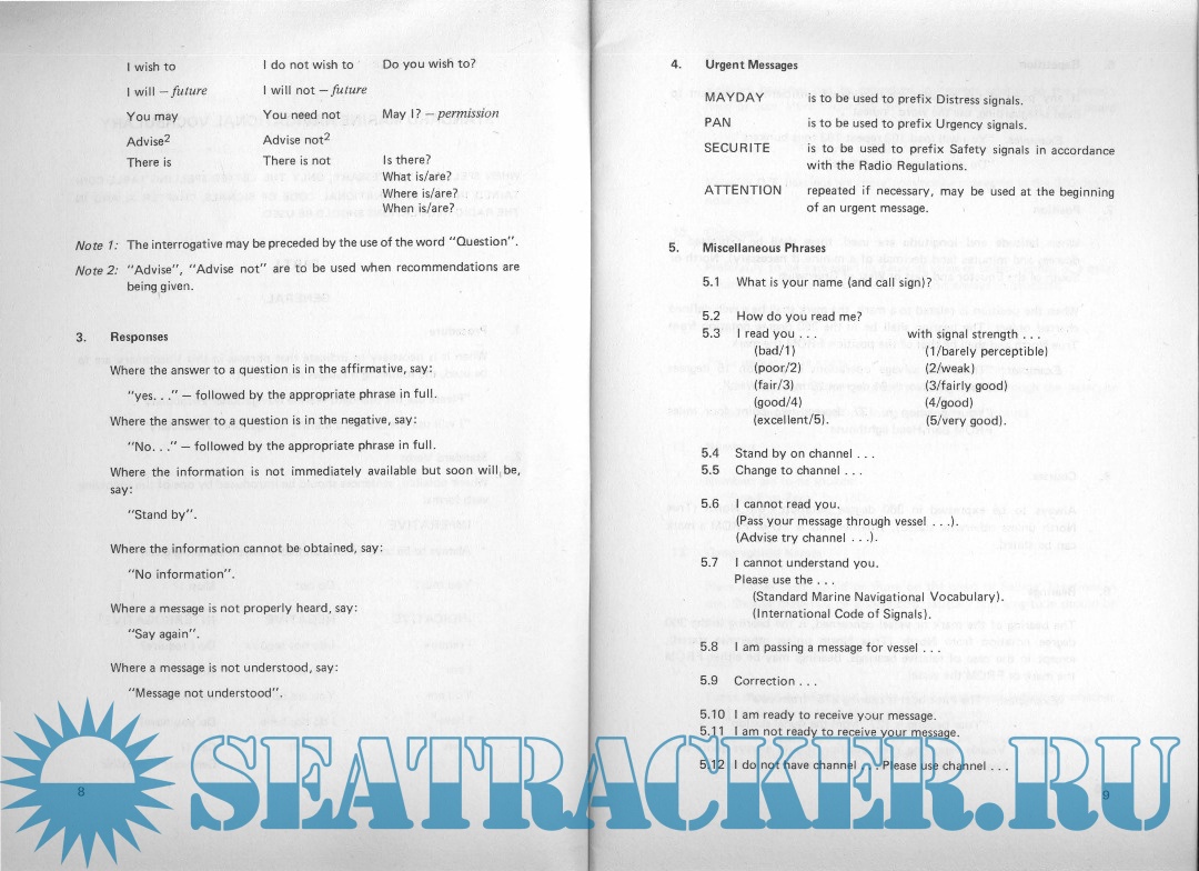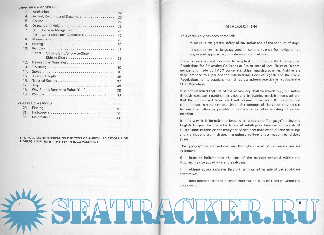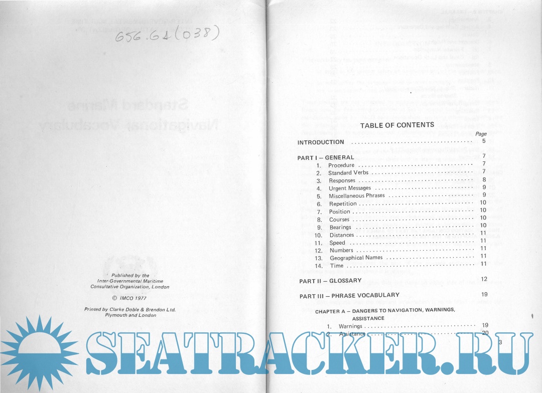 Year: 1977 Language: English Author: Inter-governmental maritime consultative organization Genre: Dictionary Publisher: Inter-governmental maritime consultative organization Format: PDF Quality: Scanned pages Pages count: 25 Description: This vocabulary has been compiled: - to assist in the greater safety of navigation and of the conduct of ships. - to standardize the language used in communication for navigation at sea, in port-approaches, in waterways and harbours. These phrases are not intended to supplant or contradict the 1nternational Regulations for Preventing Collisions at Sea or special local Rules or Recommendations made by IMCO concerning ships' routeing schemes. Neither are they intended to supersede the 1nternational Code of Signals and the Radio Regulations nor to supplant normal radiotelephone practice as set out in the ITU Regulations.