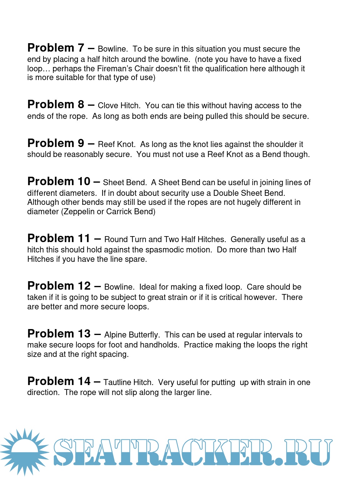 Year: - Language: English Author: - Genre: Manual Format: PDF Quality: Scanned pages Pages count: 28 Description: Knots & Their Uses • a good knot holds but is easy to open if necessary • there are different knots for different purposes and all knots are not good for all purposes • practice makes perfect • a good knot needs not to be complicated, use the simplest one good enough for the job • there is a difference in situations where there is constant pull on the rope or if it is sometimes loose and sometimes taut • sometimes it is important to be able to open the knot, even if there is a heavy load on the line • learn the difference of the wrong way to do it and the right way to do it, especially how the wrong way to do it causes the knot to slip or makes it difficult to open