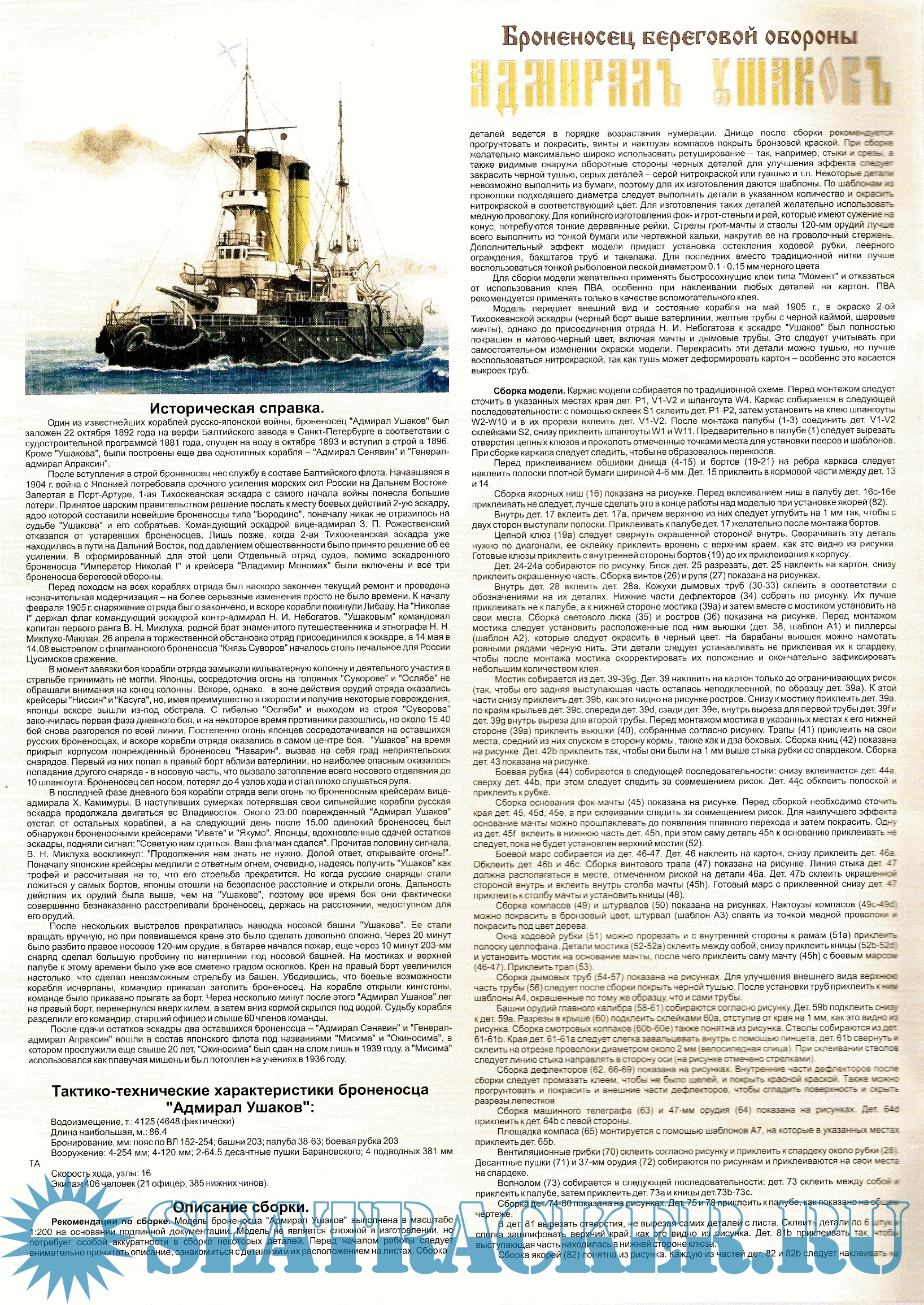 Описание: 15 листов цветных выкроек и инструкций для изготовления бумажной модели броненосца береговой обороны ''Ушаков'' 1905 год (Россия) в масштабе 1:200