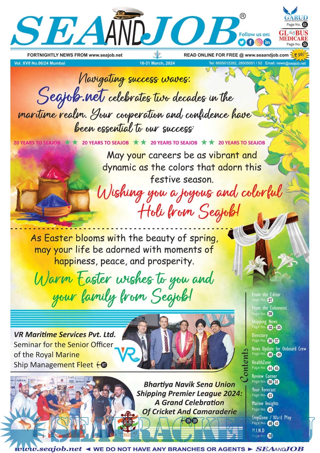 Year: 2024 Language: English Author: Sea Line Group Genre: Periodical (magazine) Edition: Vol. XVII, No. 06/24 Format: PDF Quality: Scanned pages + text layer Pages count: 72 Description: The Sea and Job magazine launched in May 2007, was the second venture of Sea Line Group succeeding 'seajob.net' bringing the much renowned essence to the Group, the Sea and Job Magazine quickly gained popularity, becoming the No. 1 Shipping Magazine that came to be widely circulated all over India. Sea and Job over the years has evolved as the most trusted, ethical, objective and read maritime publication that possesses a large database of subscribers from various verticals in the industry.The magazine provides informative and interesting articles covering not just the shipping world but also the world outside it.Sea and Job is also a medium for the shipping/ manning companies to advertise marine jobs and also to promote their organization by publicizing internal activities like seminars, sports events and parties.Some notable endeavors of the magazine include the Know Your Recruiter Column, the Sailing Episodes Column and the Marine Insights section. The consistent efforts and the dedication to provide extraordinary services to the industry has resulted in the magnifying popularity and patronage of Sea and Job. Additional info: 16-31 March 2024.