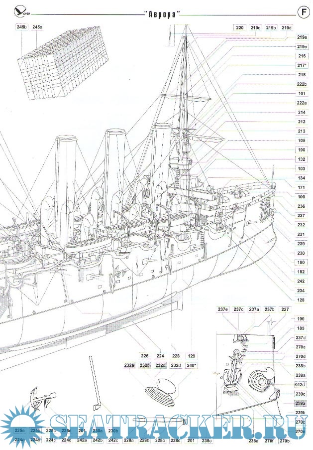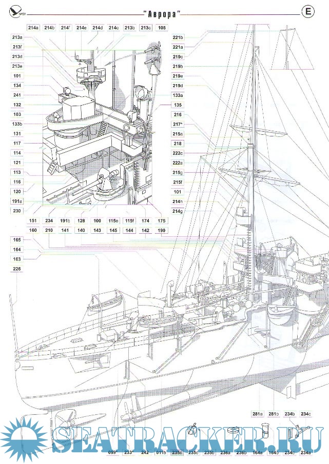 43 листа цветных выкроек и инструкций для изготовления бумажной модели бронепалубного крейсера 1 ранга ''Аврора'' по состоянию на 1903 год в масштабе 1:200