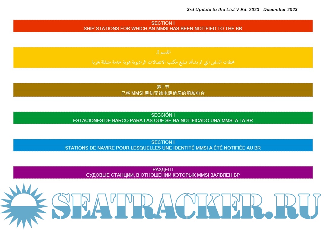 Additional info: A compilation of amendments to the ITU ship stations database since the latest edition of the List of Ship Stations and Maritime Mobile Service Identity Assignments -List V. For updated list refer: https://www.itu.int/en/ITU-R/te...pdatesListV.aspx