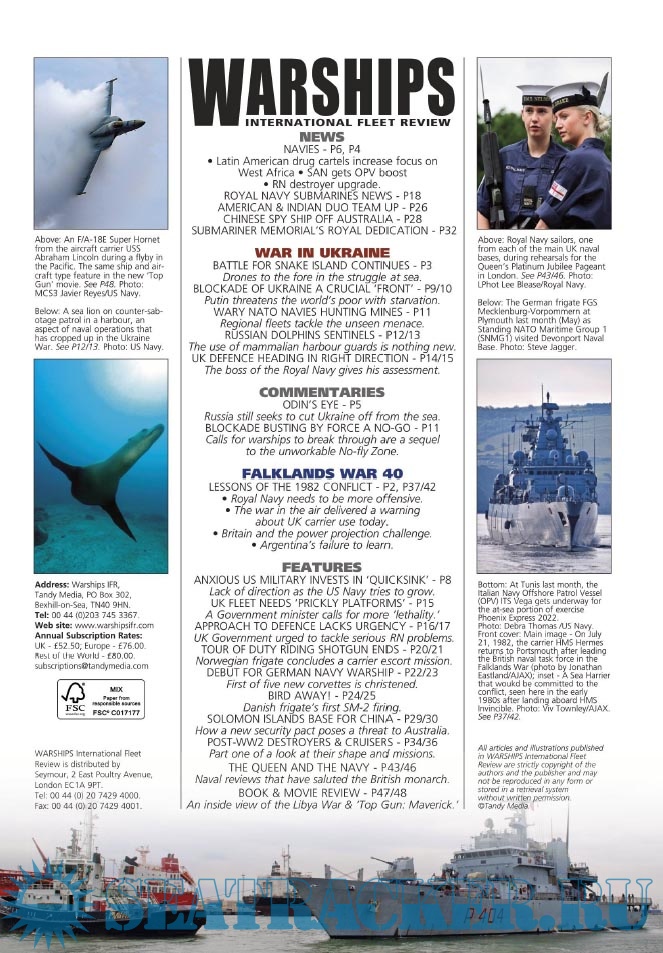 Description: Warships IFR puts the spotlight on the latest developments in the world’s navies. It covers current defence issues and has comments by leading analysts. The magazine regularly includes features on the Royal Navy and the US Navy in addition to incorporating news and features on all other navies across the globe. Warships IFR frequently carries in-depth articles on naval heritage.WARSHIPS International Fleet Review is published 12 times a year by Tandy Media Ltd who also publish Shipping Today & Yesterday (which provides news and features from the world of merchant shipping).