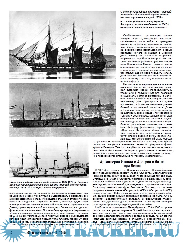 Описание: Данный тематический выпуск «Морской кампании» посвящен 150-летнему юбилею сражения при Лиссе, состоявшегося 20 июля 1866 г. Оно не только вошло в историю как первое крупное сражение броненосных флотов (не отдельных броненосцев, а именно флотов!) и вывело Австрию в число ведущих морских держав, но и оказало основополагающее влияние на развитие военного кораблестроения и тактики на последующие полстолетия.