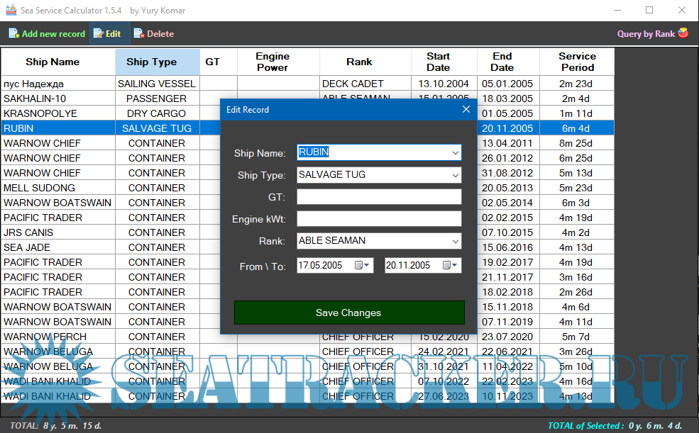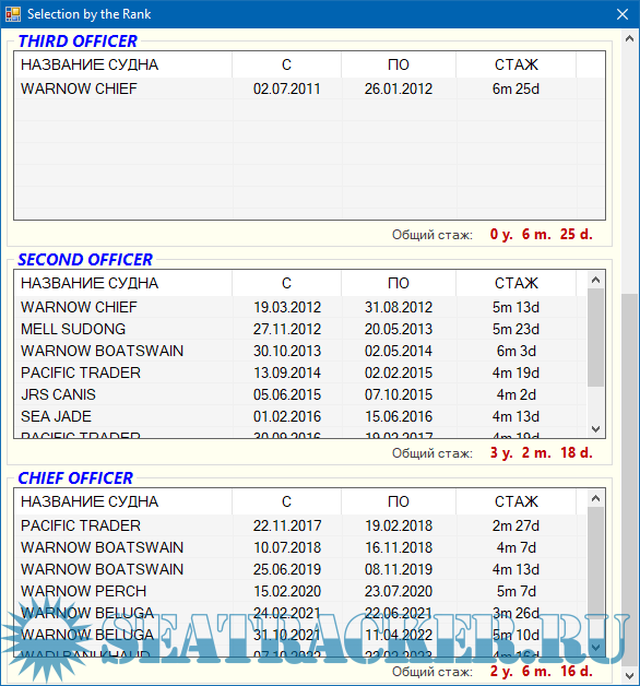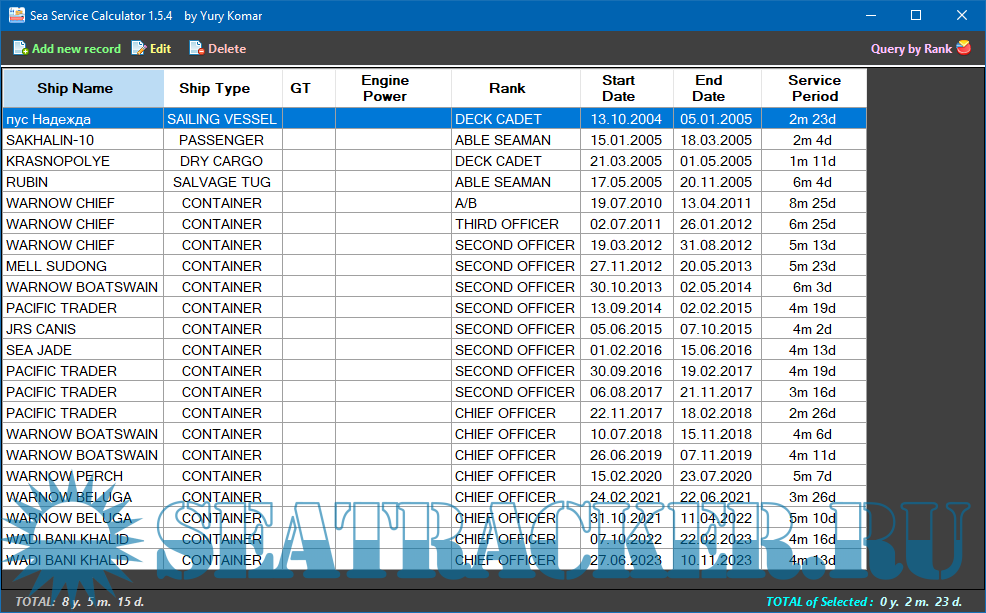 Year: 2025 Version: 1.5.6 Developer: Yury Komar Platform: Windows 64-bit OS compatibility: yes Localization: English Crack: Not needed Description: Keep records of sea work experience on the ships. • Displays the total duration of service for the entire period (whole list), as well as separately by rank\position. • The calculation of the duration of service is carried out according to the accepted rules for keeping sea service certificates. • Allow Sorting records by click on Column header • App keep your sorting saved and reload it while opening Additional info: Made with ❤ in Vladivostok. Please support the project:http://sea-soft.ru/donate.html If any application from Sea-Soft Project has helped you with routine job or simplifying any other tasks, consider supporting its continued development with a small donation! ???? Any donations large or small are greatly appreciated :) A massive THANK YOU to everyone who's already donated and supported the coding! ☕️ Donate (https://t.me/tribute/app?startapp=deT5) (EUR via Telegram) Donate (https://boosty.to/sea-soft/donate) (Any via Boosty) Donate (https://www.sberbank.com/sms/pb...ber=79140787339) (RUB via Sber) (https://t.me/SeaSoft_by_YuryKomar/24/3558)