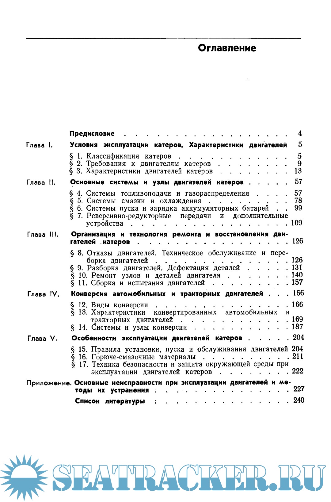 Книга предназначена для специалистов, занимающихся проектированием, производством, эксплуатацией и ремонтом двигателей катеров, а также для обслуживающего персонала водно-туристских баз и яхт-клубов.