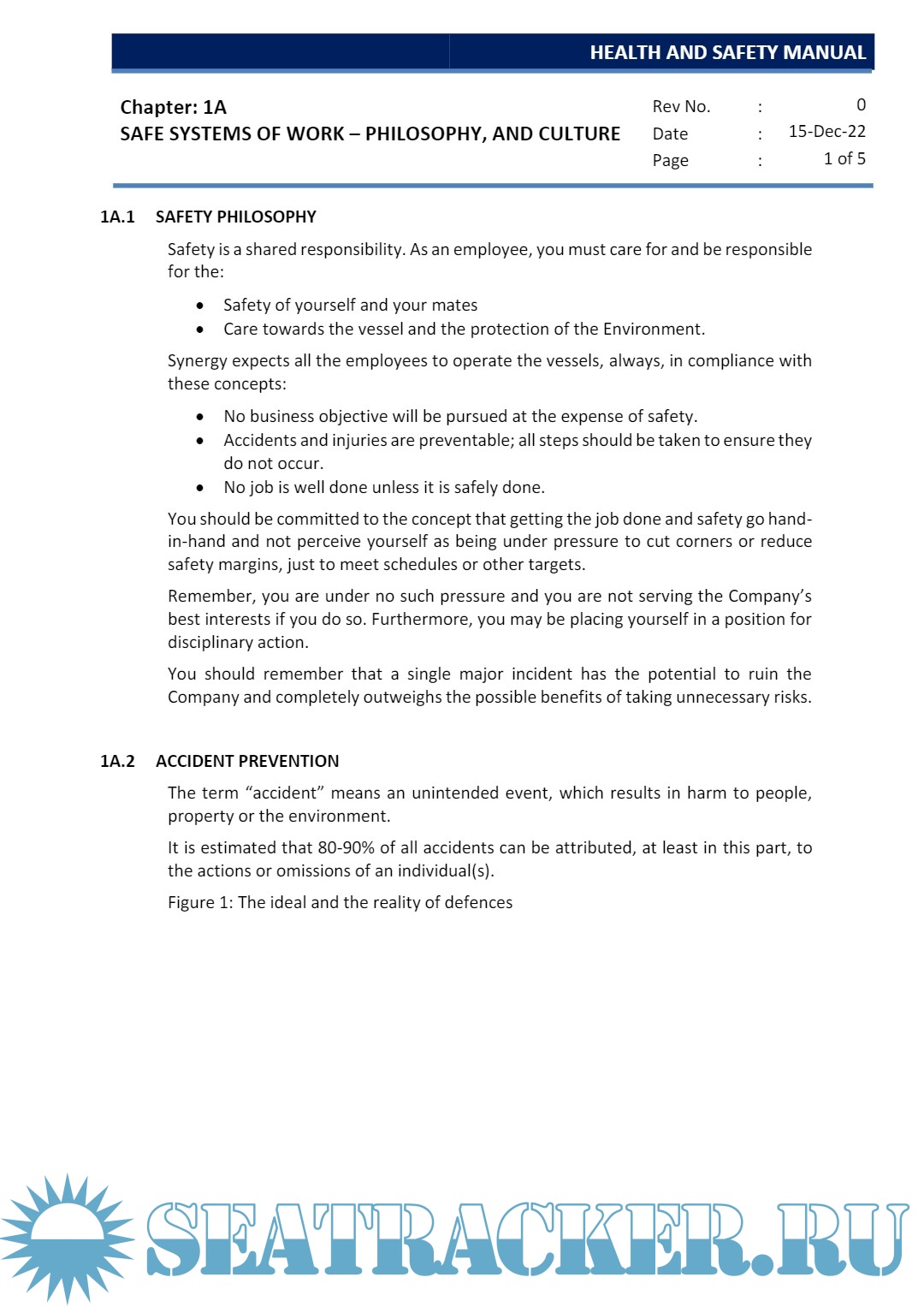 Description: Safety is a shared responsibility. As an employee, you have a duty to care and responsible for:▪ Safety for yourself and your mates▪ Care towards the vessel and the protection of the Environment.Synergy expects all the employees to operate the vessels, at all times, in compliance with these concepts:▪ No business objective will be pursued at the expense of safety.▪ Accidents and injuries are preventable; all steps should be taken to ensure they do not occur.▪ No job is well done unless it is safely done.You should be committed to the concept that getting the job done and safety go handin-hand, and do not perceive yourself as being under pressure to cut corners or reduce safety margins, to meet schedules or other targets.Remember, you are under no such pressure, and you are not serving the Company’s best interests if you do so. Furthermore, you may well be placing yourself in a position for disciplinary action.You should remember that a single major incident has the potential to ruin the Company, and completely outweighs the possible benefits from taking unnecessary risks.