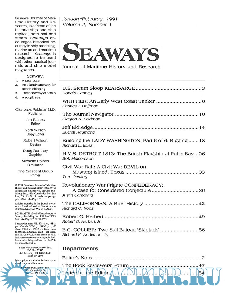Year: 1991 Language: English Author: Seaways volume 1 №1 Genre: Normative document Edition: 1991-1 Format: PDF Quality: Scanned pages Pages count: 64 Description: Seaway is the home port for Seaways Ships in Scale magazine, the leading workshop and research magazine for the ship modeler. In the magazine we explore all levels of modeling experience, all types of ships, all kinds of models, all historical eras and all construction materials
