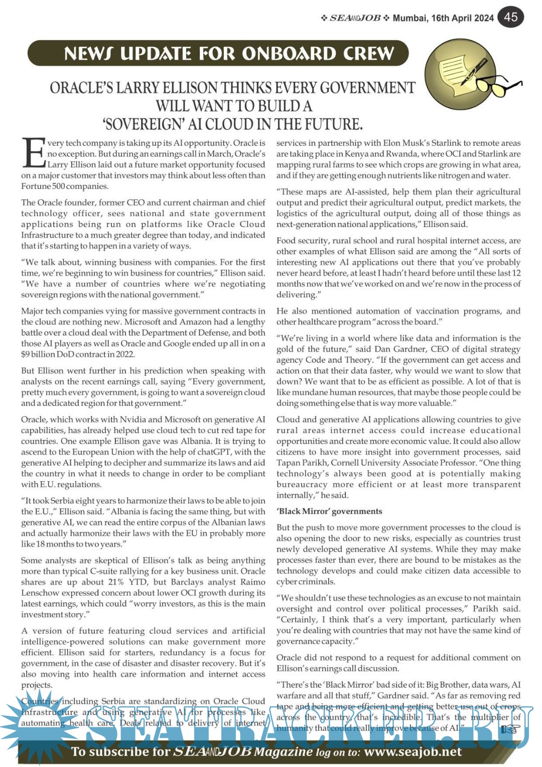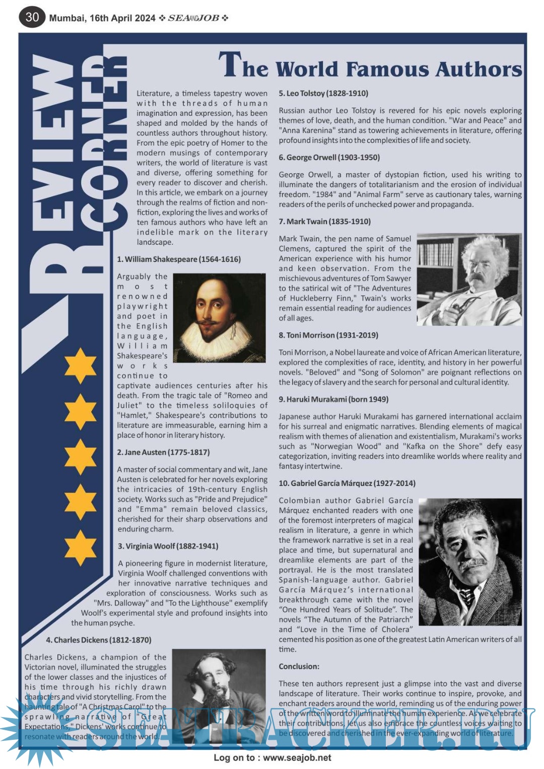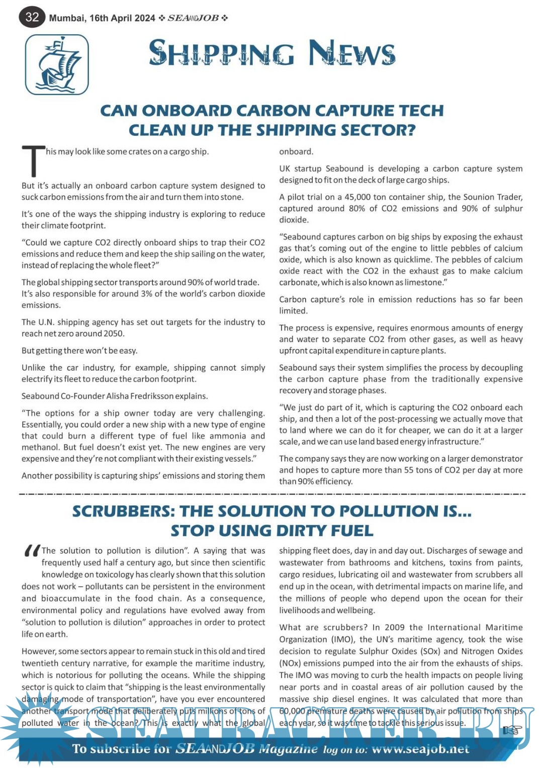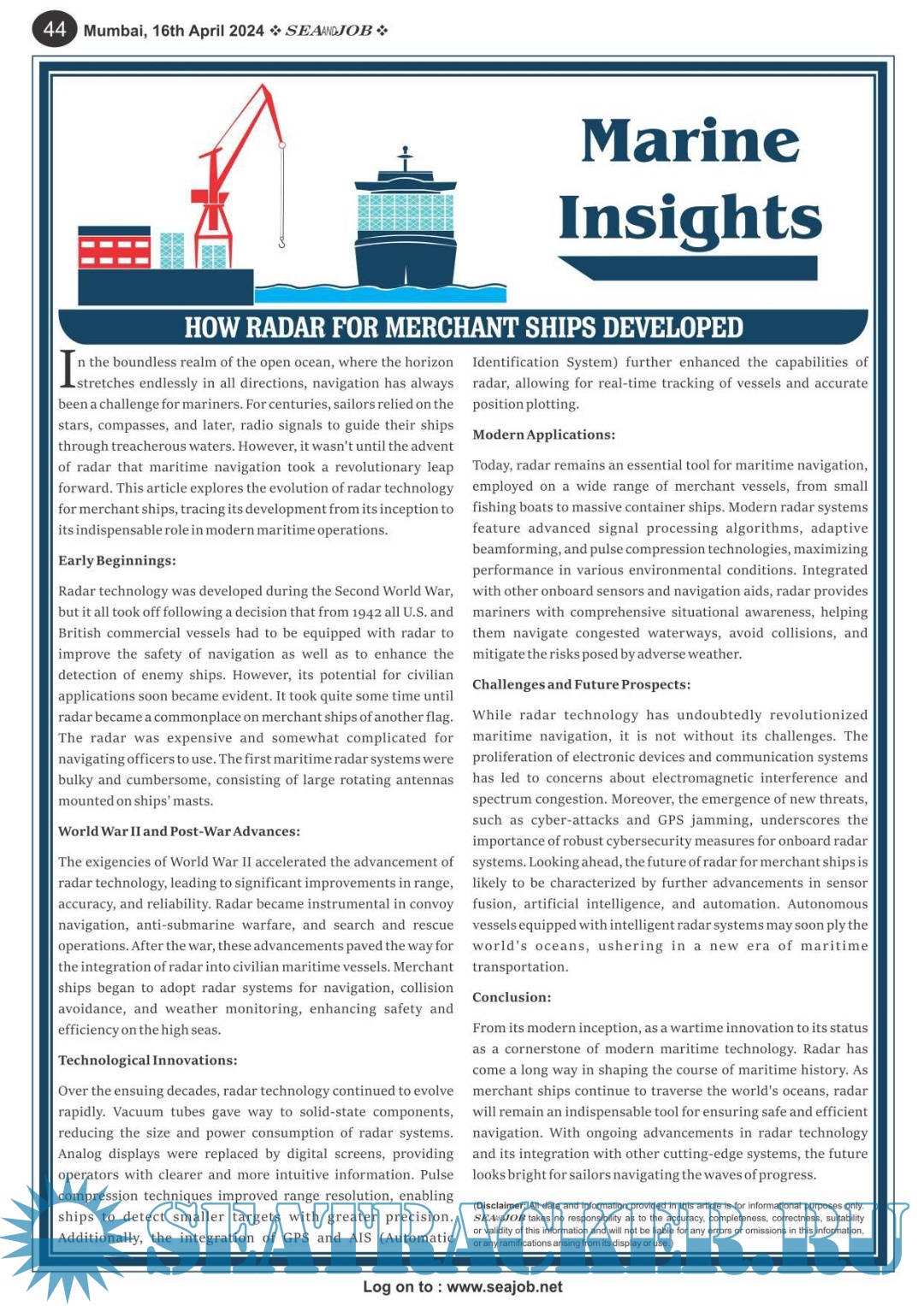 Description: The Sea and Job magazine launched in May 2007, was the second venture of Sea Line Group succeeding 'seajob.net' bringing the much renowned essence to the Group, the Sea and Job Magazine quickly gained popularity, becoming the No. 1 Shipping Magazine that came to be widely circulated all over India. Sea and Job over the years has evolved as the most trusted, ethical, objective and read maritime publication that possesses a large database of subscribers from various verticals in the industry.The magazine provides informative and interesting articles covering not just the shipping world but also the world outside it.Sea and Job is also a medium for the shipping/ manning companies to advertise marine jobs and also to promote their organization by publicizing internal activities like seminars, sports events and parties.Some notable endeavors of the magazine include the Know Your Recruiter Column, the Sailing Episodes Column and the Marine Insights section. The consistent efforts and the dedication to provide extraordinary services to the industry has resulted in the magnifying popularity and patronage of Sea and Job.