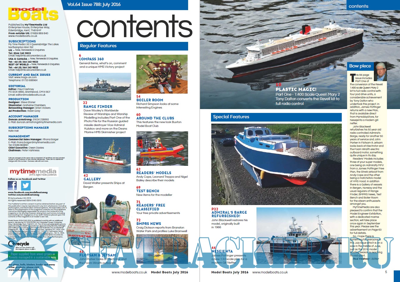 Description: Model Boats magazine is a practical and informative read for those with a love for the hobby. It covers the latest news and views from the various clubs and associations around the country, useful hints, tips and step by step guides for those interested in the art of constructing a model boat as well as tests and recommendations of new boats and tools. Floating along behind these are great special features examining in depth different models from narrowboat to destroyer!